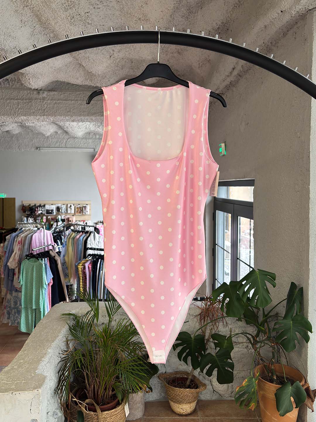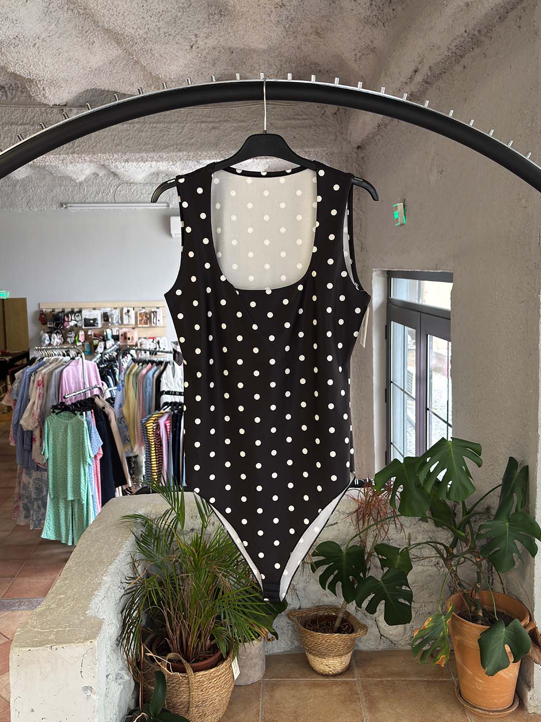 Το διαχρονικό πουά μοτίβο συνδυάζεται με εφαρμοστή γραμμή που αγκαλιάζει το σώμα και αναδεικνύει τη σιλουέτα. Η αμάνικη γραμμή και το ελαφρώς ανοιχτό ντεκολτέ το κάνουν ιδανικό για καλοκαιρινά looks αλλά και για layering κάτω από σακάκια ή πουκάμισα.