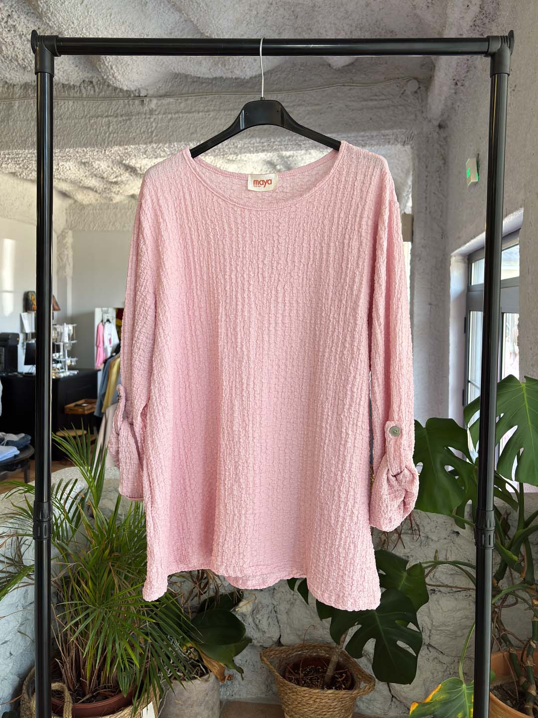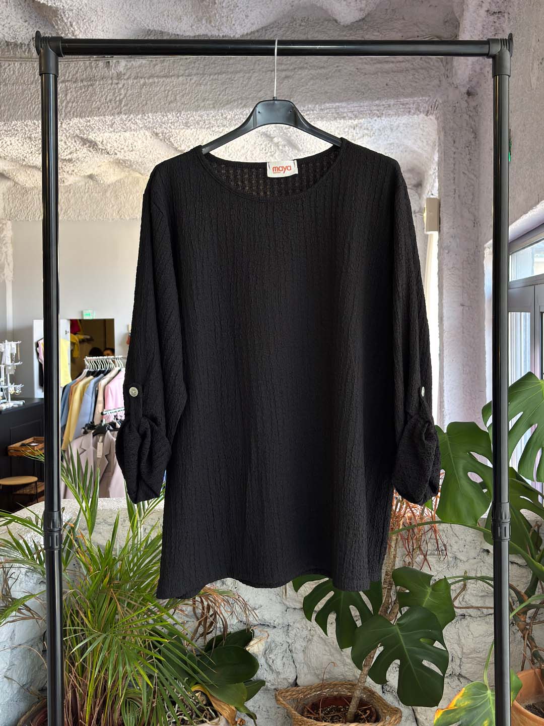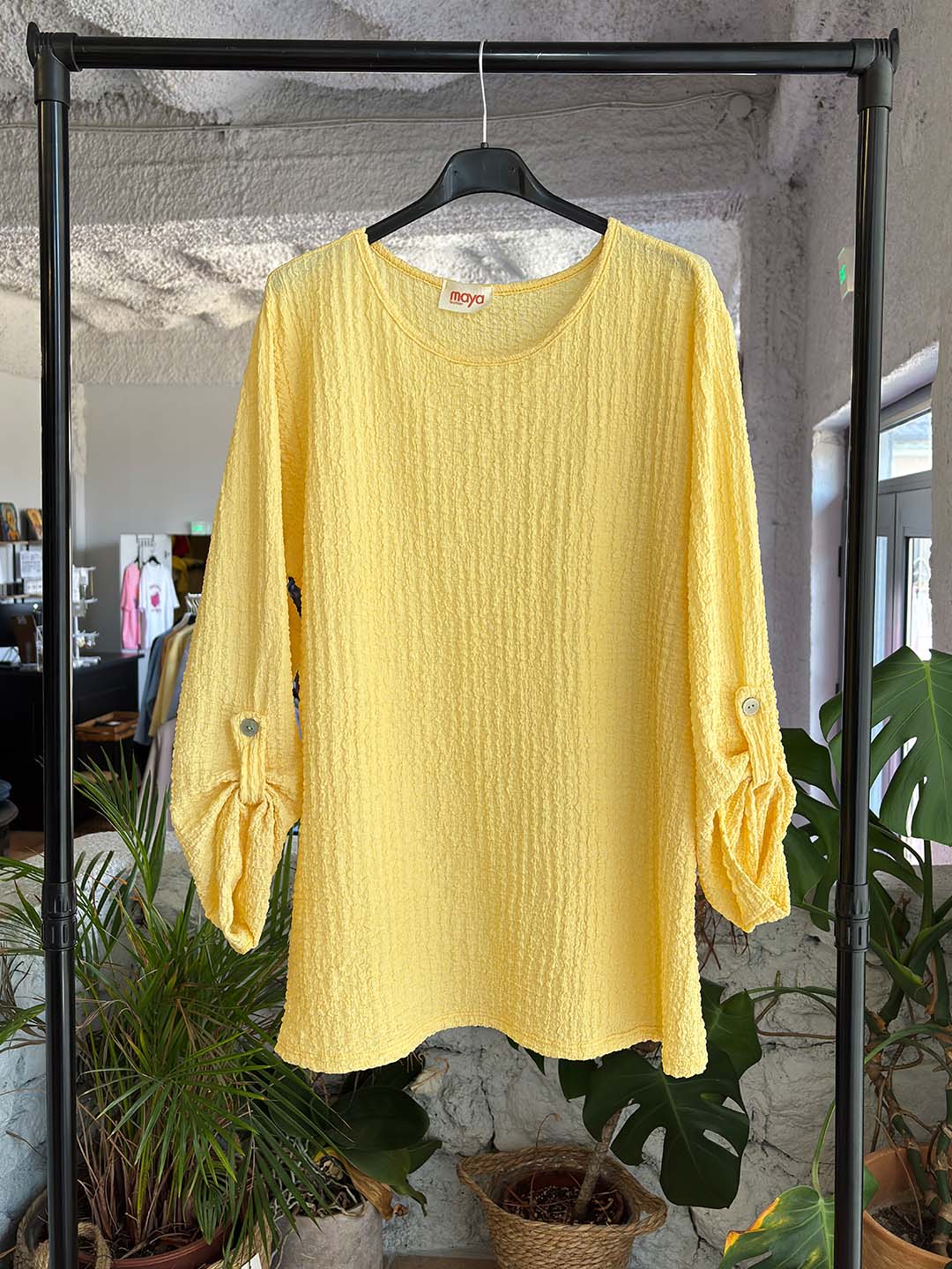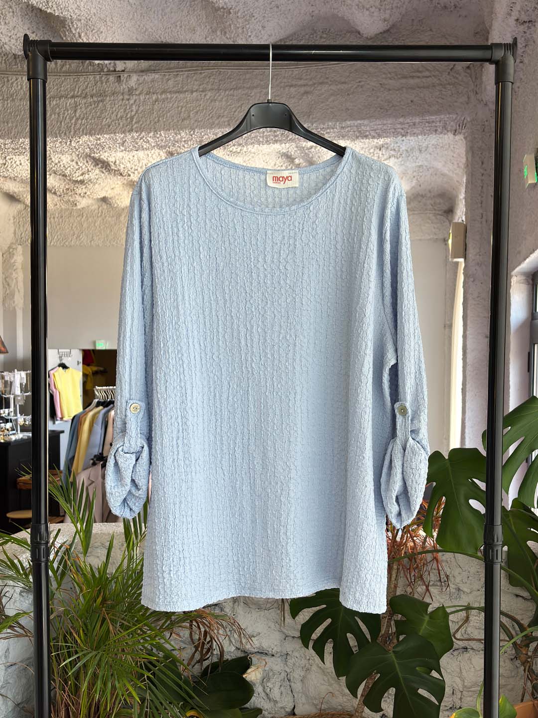 Άνετη μπλούζα τύπου γκοφρέ με απαλή υφή που χαρίζει μοναδική αίσθηση στο σώμα και ξεχωριστό στυλ σε κάθε εμφάνιση. Η χαλαρή γραμμή της την κάνει ιδανική για καθημερινά looks, ενώ τα μανίκια διαθέτουν κουμπί ώστε να φοριούνται διπλωμένα, δημιουργώντας ένα πιο ανεπιτήδευτο και stylish αποτέλεσμα.
