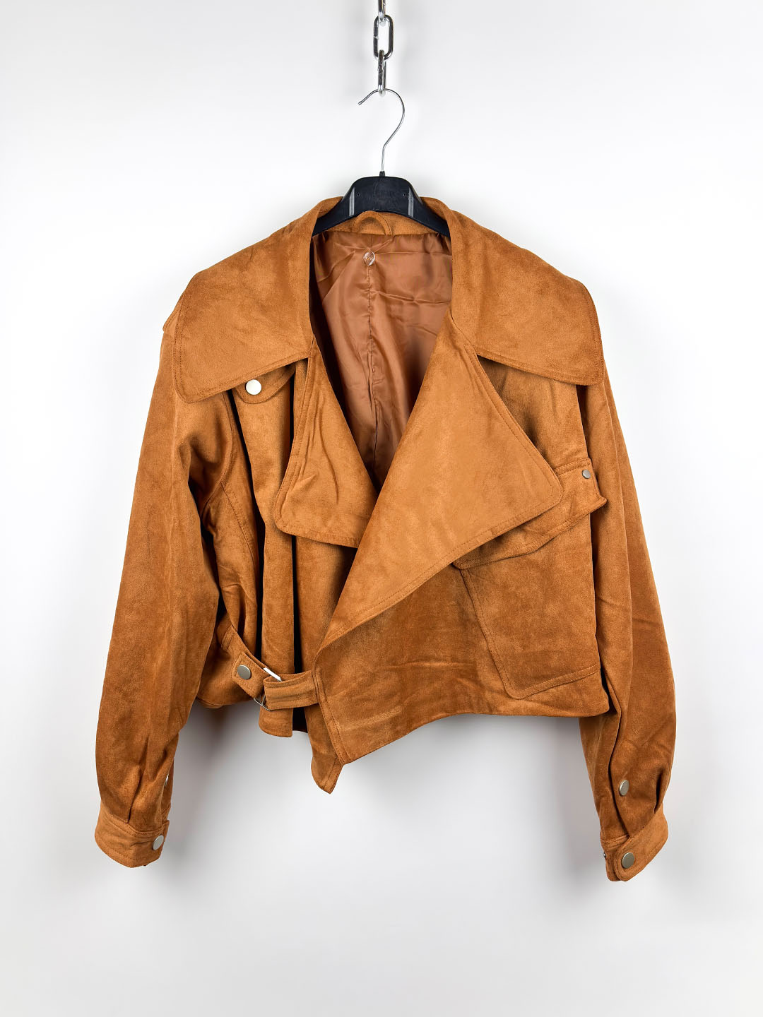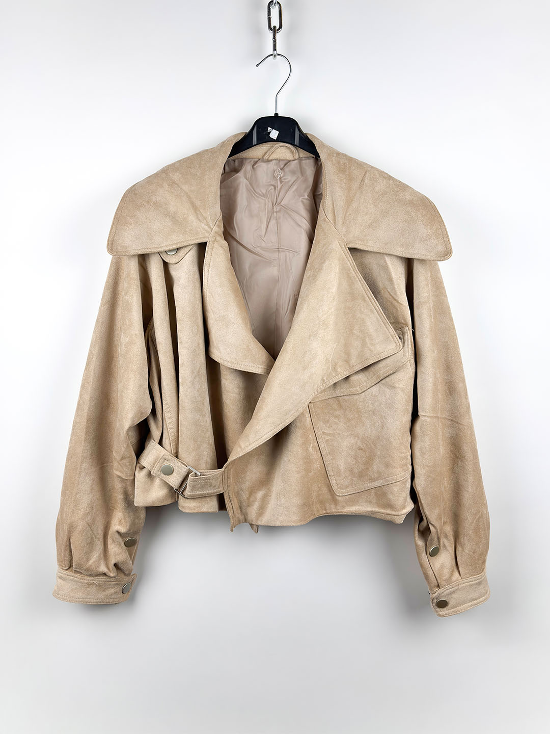 Στυλάτο σουέτ jacket σε με μοντέρνο χαρακτήρα που αναδεικνύει κάθε εμφάνιση. Ο μεγάλος γιακάς δίνει έντονο στυλ, ενώ η ζώνη στη μέση προσθέτει extra ενδιαφέρον και δίνει τη δυνατότητα για πιο εφαρμοστό αποτέλεσμα.