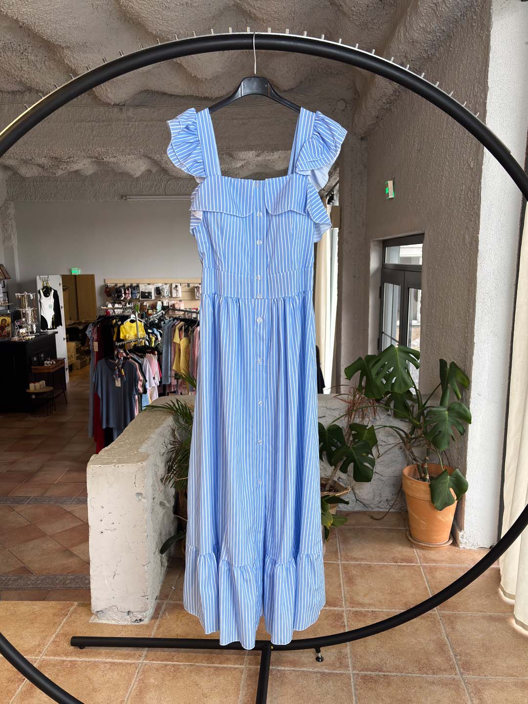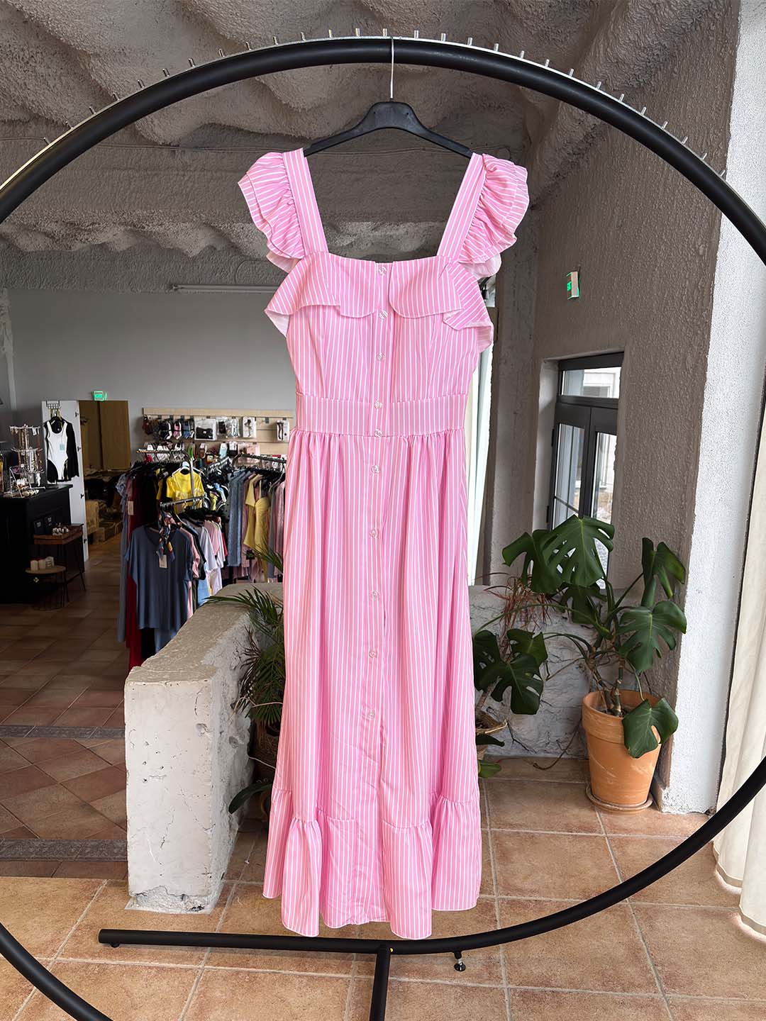 Το Candy Stripe Dress ξεχωρίζει με τις λεπτές ρίγες, τα ρομαντικά βολάν στους ώμους και τη maxi αέρινη γραμμή του.