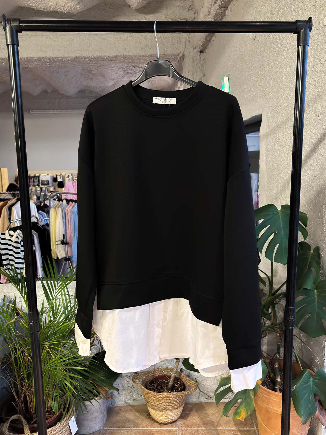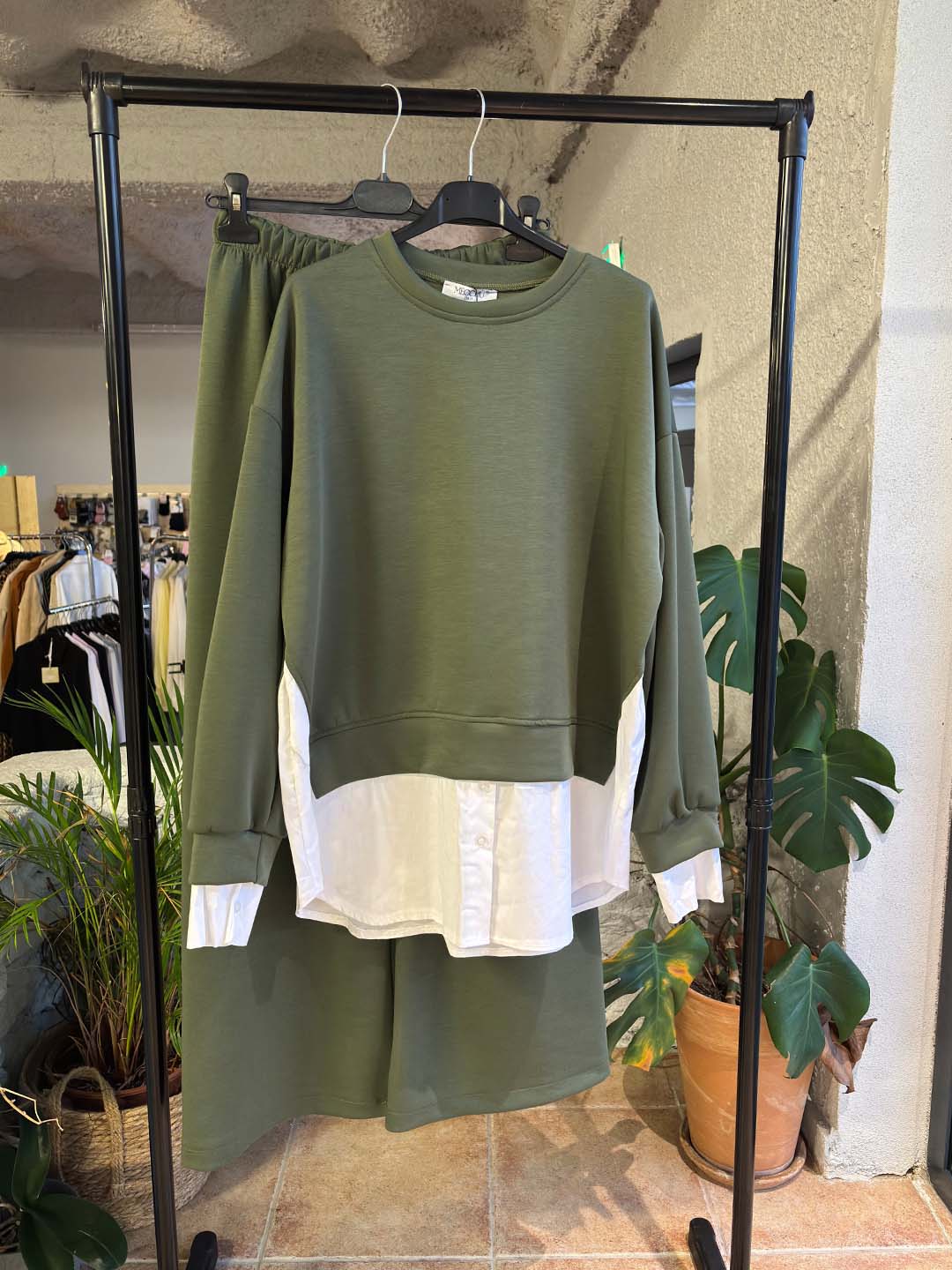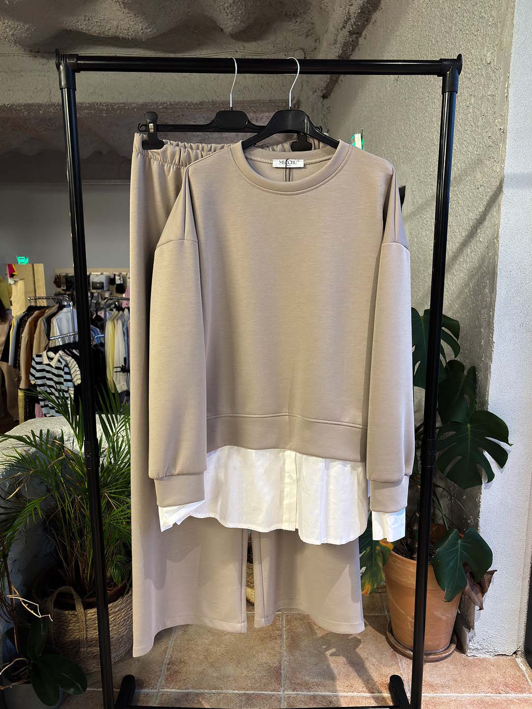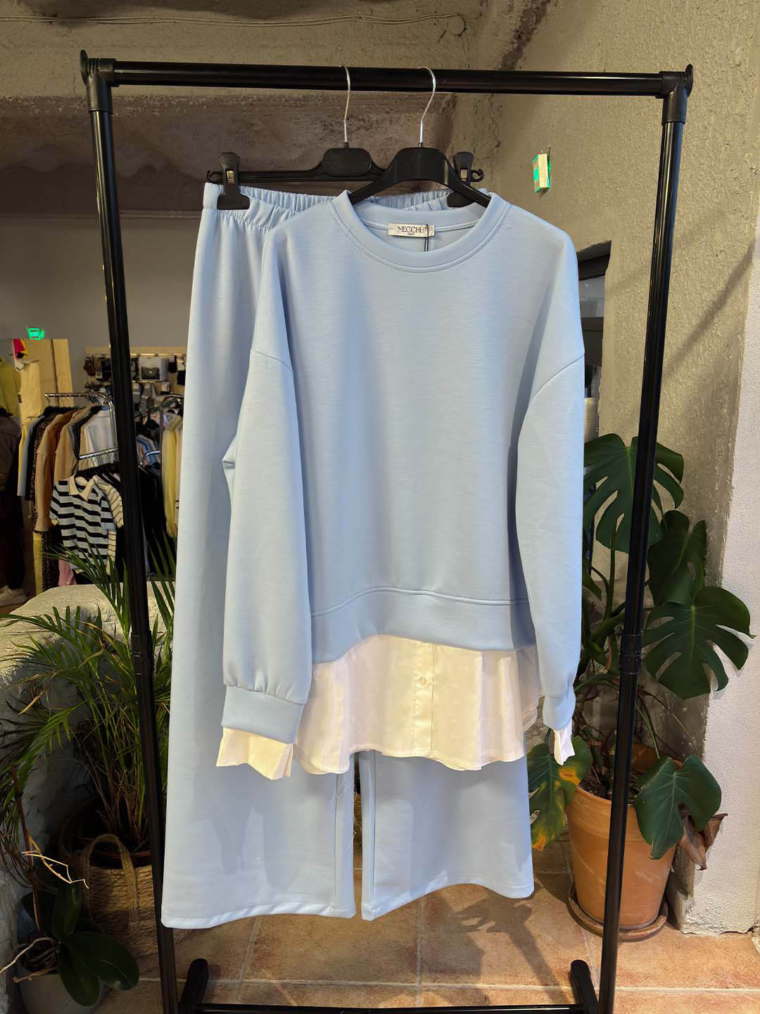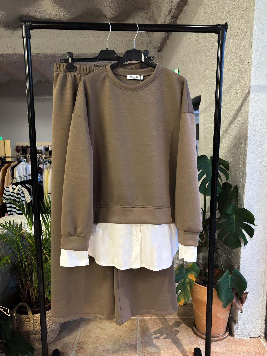 Άνετο και κομψό σετ από baby φούτερ ύφασμα, με ιδιαίτερη λεπτομέρεια στο τελείωμα που δίνει την αίσθηση layered πουκαμίσου. Η μπλούζα έχει χαλαρή γραμμή με μακρύ μανίκι και στρογγυλή λαιμόκοψη, ενώ το διακριτικό τελείωμα στο κάτω μέρος προσθέτει extra στυλ χωρίς να χάνει την άνεση.