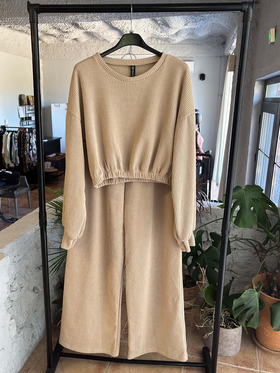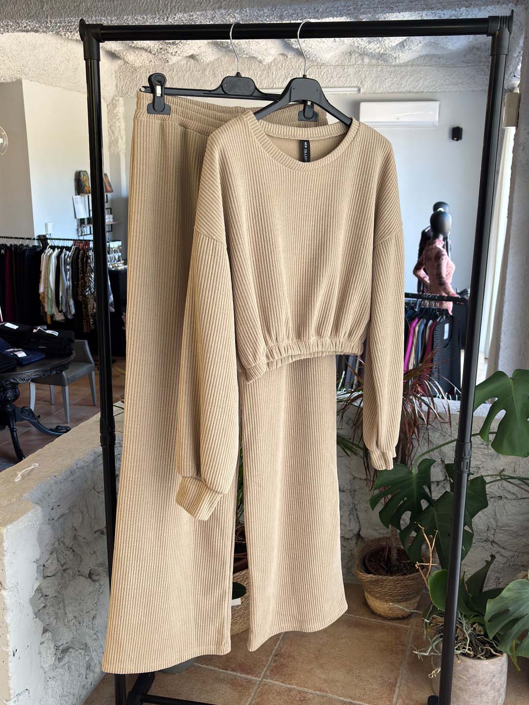 Σετ Εκρού Κοτλέ Φόρμες Με Crop Μπλούζα