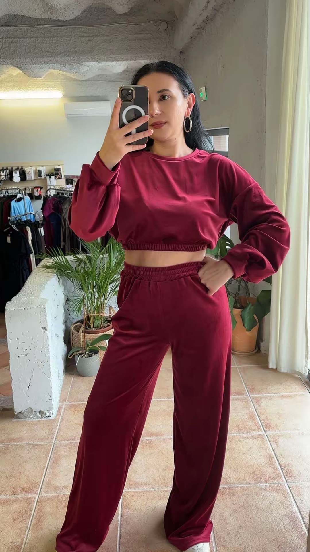 Σετ Φόρμες Μπορντό Βελουτέ Με Crop Μπλούζα
