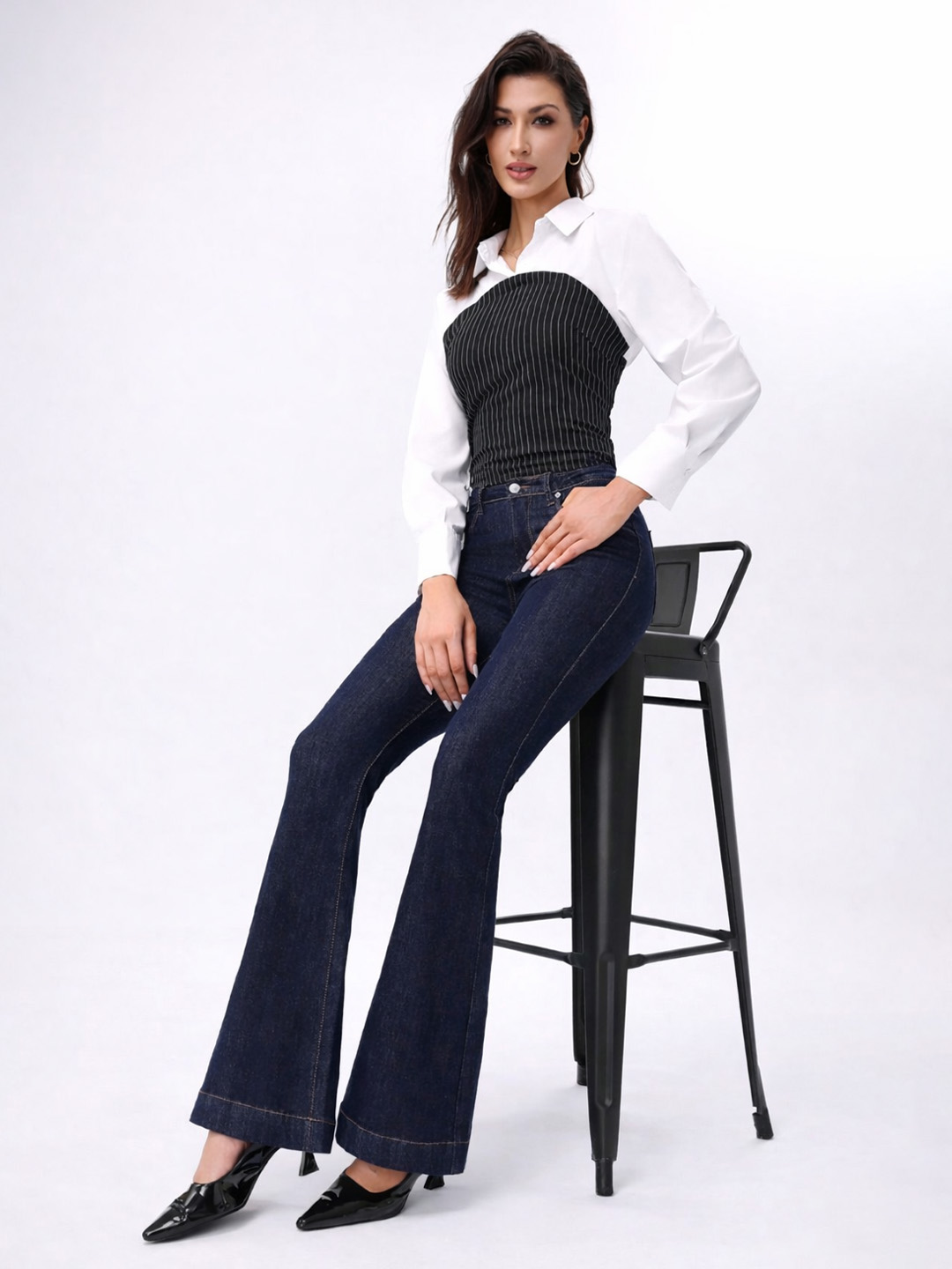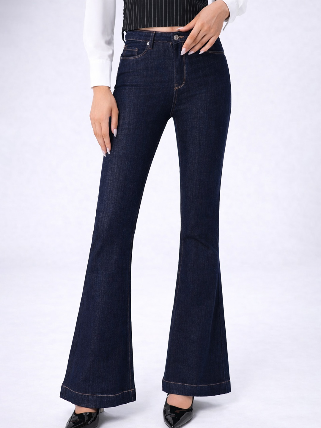 Τζιν παντελόνι σε γραμμή flare που χαρίζει κομψή και θηλυκή σιλουέτα. Εφαρμόζει στη μέση και στους γοφούς και ανοίγει από το γόνατο και κάτω, επιμηκύνοντας οπτικά τα πόδια. Ύφασμα με ελαστικότητα για άνεση στην καθημερινή χρήση, διατηρώντας παράλληλα το σχήμα του.