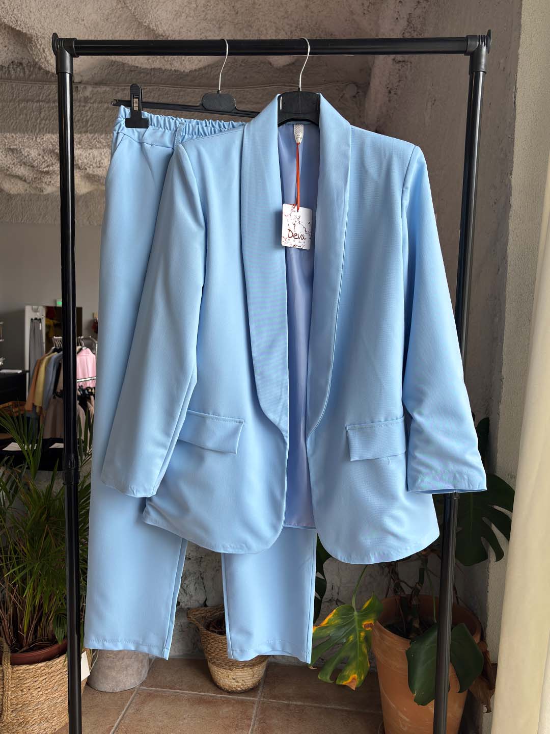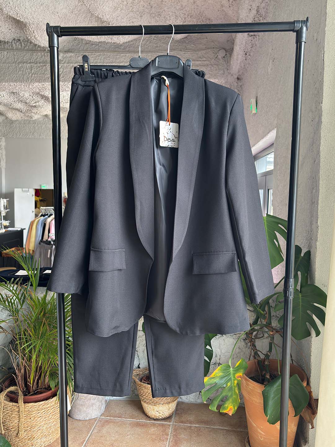 Το σακάκι διαθέτει χαλαρή γραμμή και καθαρό σχεδιασμό, ενώ το παντελόνι σε ίσια γραμμή προσφέρει άνεση και πιο καθημερινό versatile στυλ. Το ύφασμα είναι ελαφρύ και ευχάριστο, κάνοντάς το ιδανικό για κάθε περίσταση.