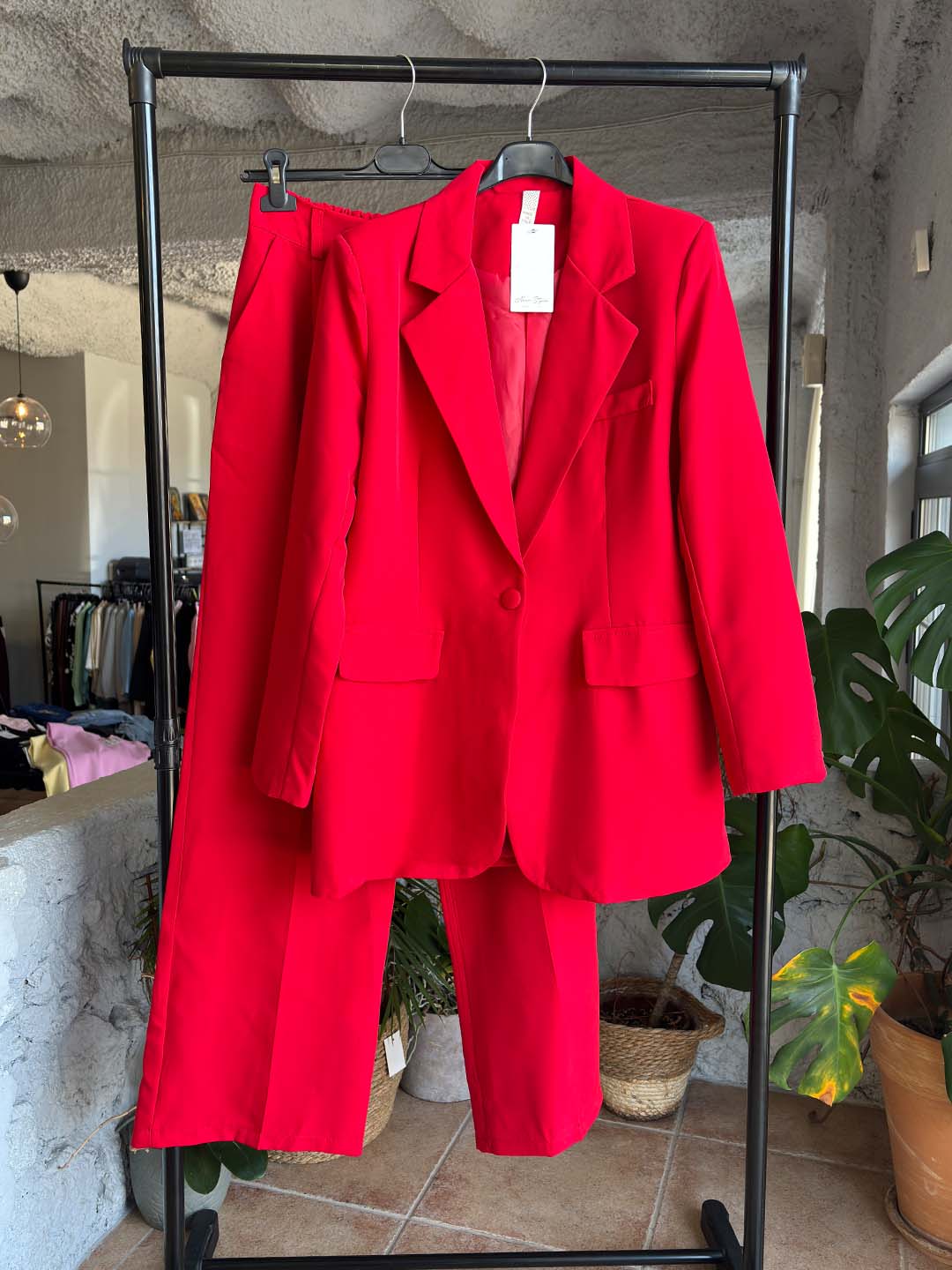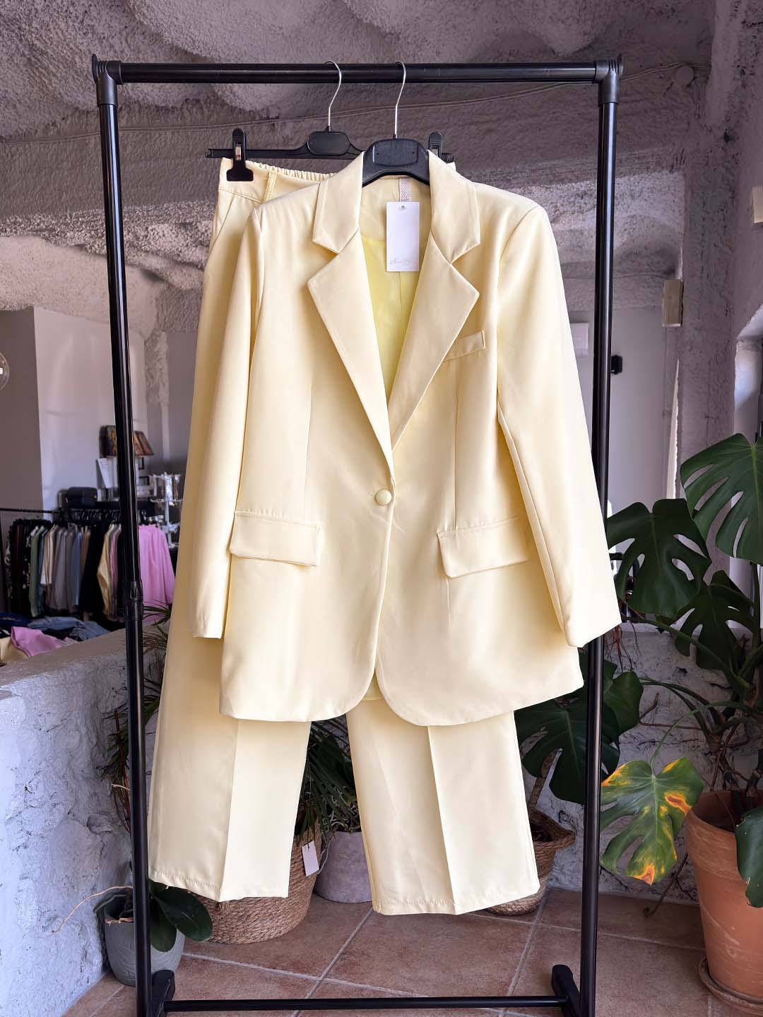 Κομψό κοστούμι με minimal αισθητική που ξεχωρίζει για την καθαρή και σύγχρονη γραμμή του. Το σακάκι σε ίσια γραμμή χαρίζει διαχρονικό στυλ, ενώ η παντελόνα wide leg πέφτει χαλαρά, δημιουργώντας μια ισορροπημένη και κομψή σιλουέτα.
