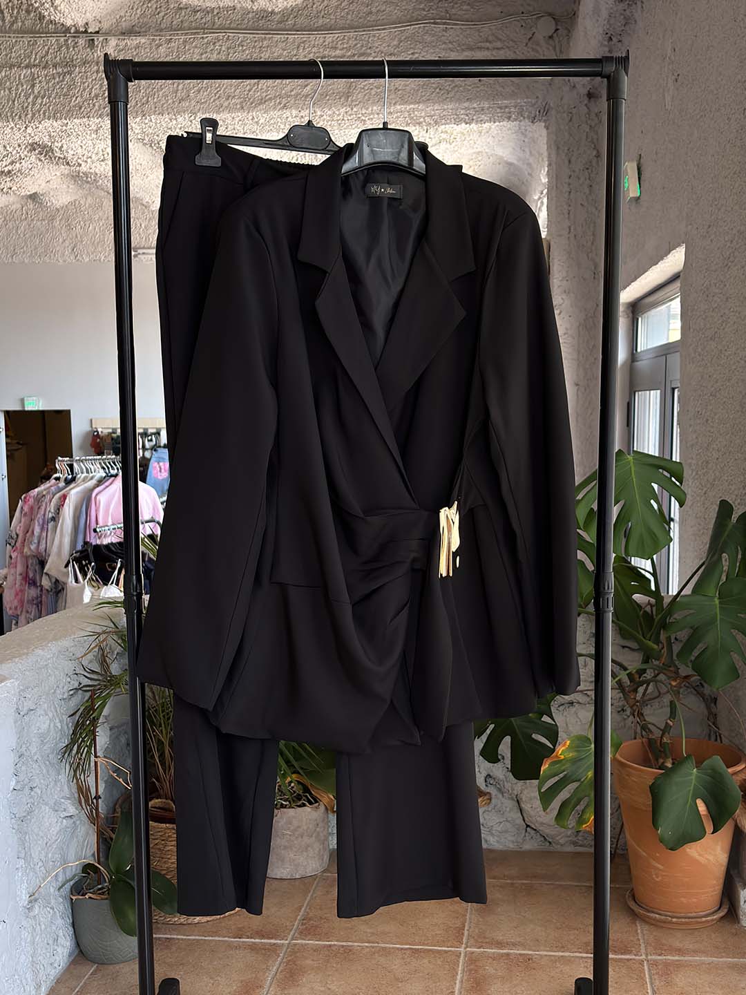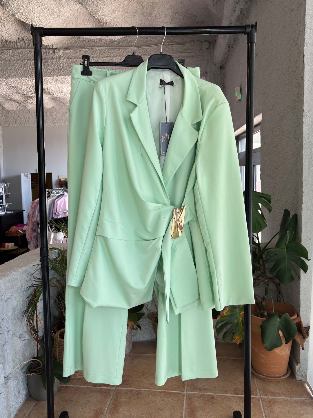 Εντυπωσιακό oversized κοστούμι σετ που αποτελείται από σακάκι και παντελόνα, ιδανικό για μοντέρνες και κομψές εμφανίσεις. Ο ιδιαίτερος σχεδιασμός του σακακιού με πλαϊνό κλείσιμο και μεταλλική αγκράφα στη μέση δίνει ένα ξεχωριστό fashion χαρακτήρα στο σύνολο.