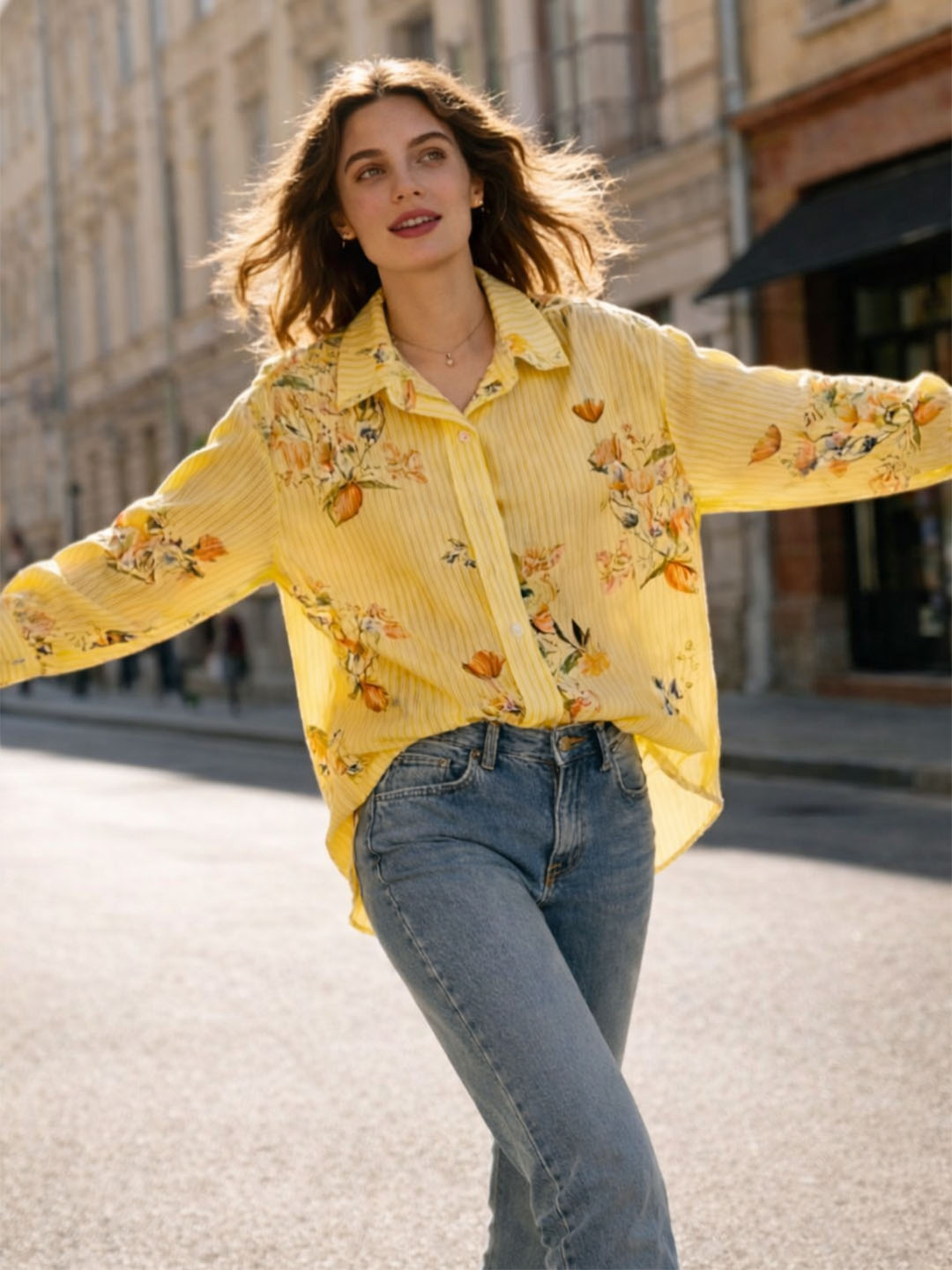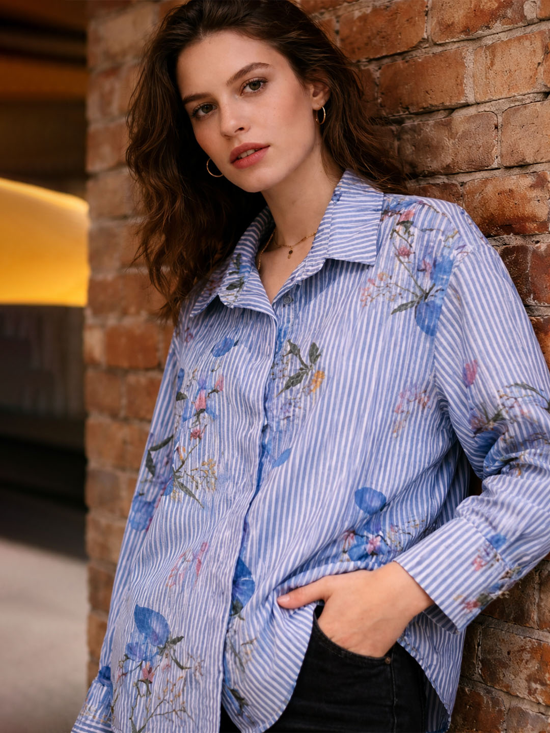 Πουκάμισο Ριγέ Με Φλοράλ Σχέδιο Oversized Γραμμή