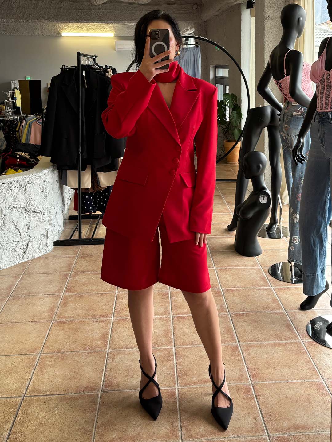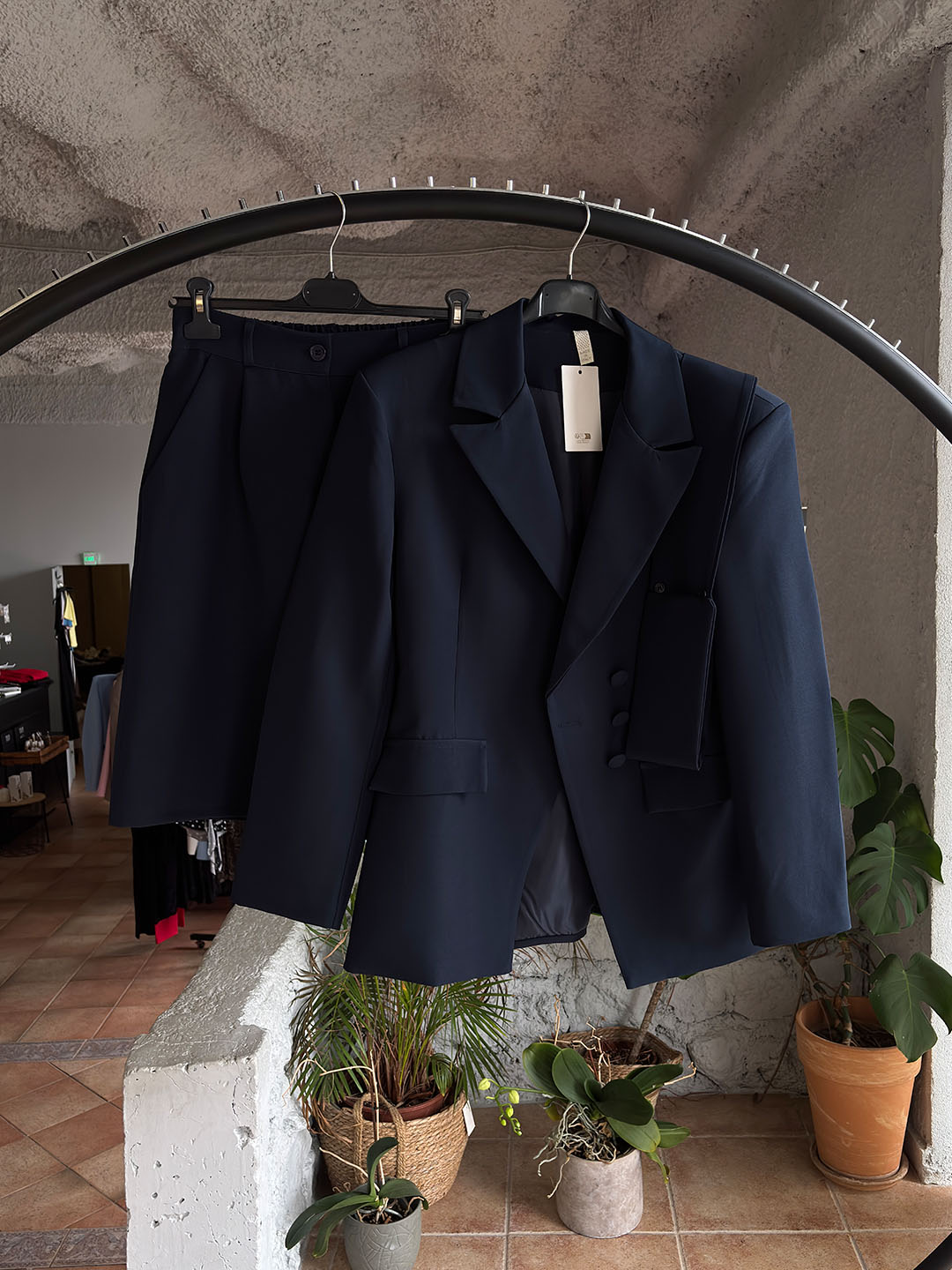 Το σακάκι έχει δομημένη γραμμή που αναδεικνύει τη σιλουέτα, ενώ η βερμούδα προσφέρει άνεση και στυλ, ισορροπώντας τέλεια ανάμεσα σε κομψότητα και καθημερινή χρήση.