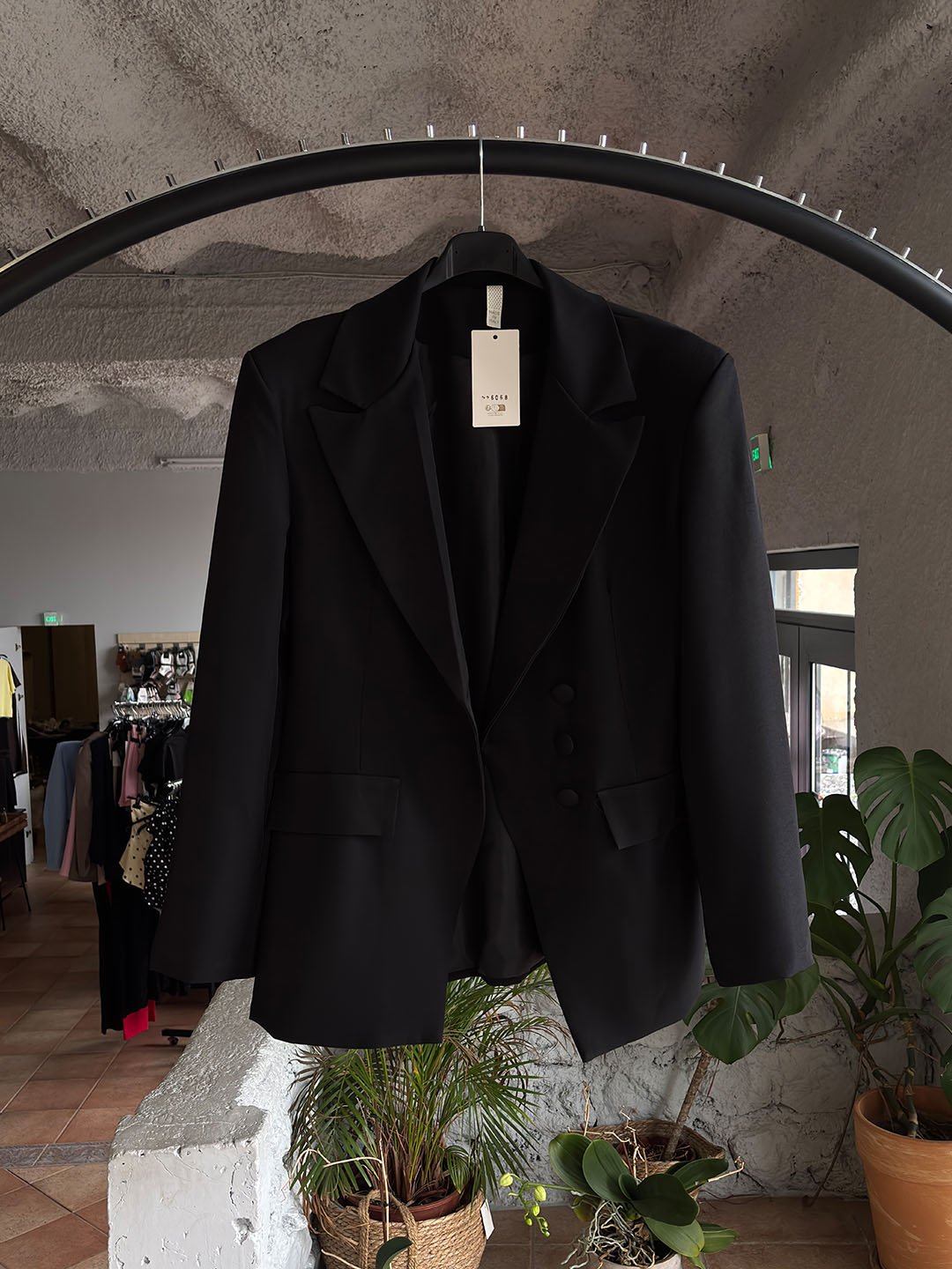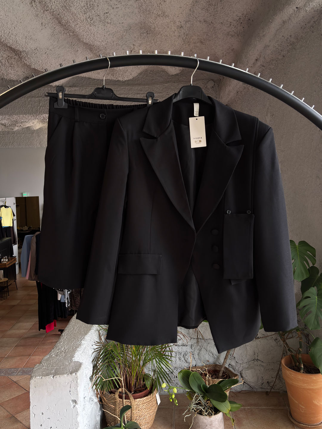 Το σετ αποτελείται από σακάκι και βερμούδα, δημιουργώντας ένα μοντέρνο και ιδιαίτερο σύνολο. Το στοιχείο που το κάνει μοναδικό είναι το ζωνάκι που κουμπώνει στον λαιμό, δίνοντας ένα fashion-forward και δυναμικό ύφος.