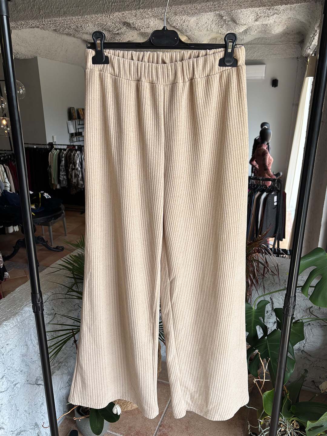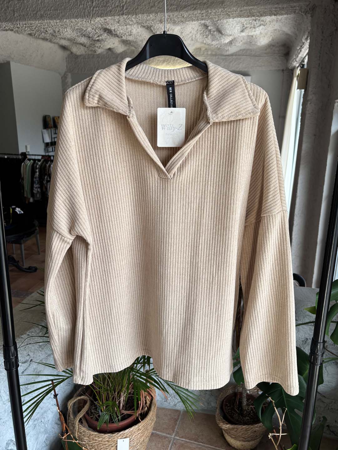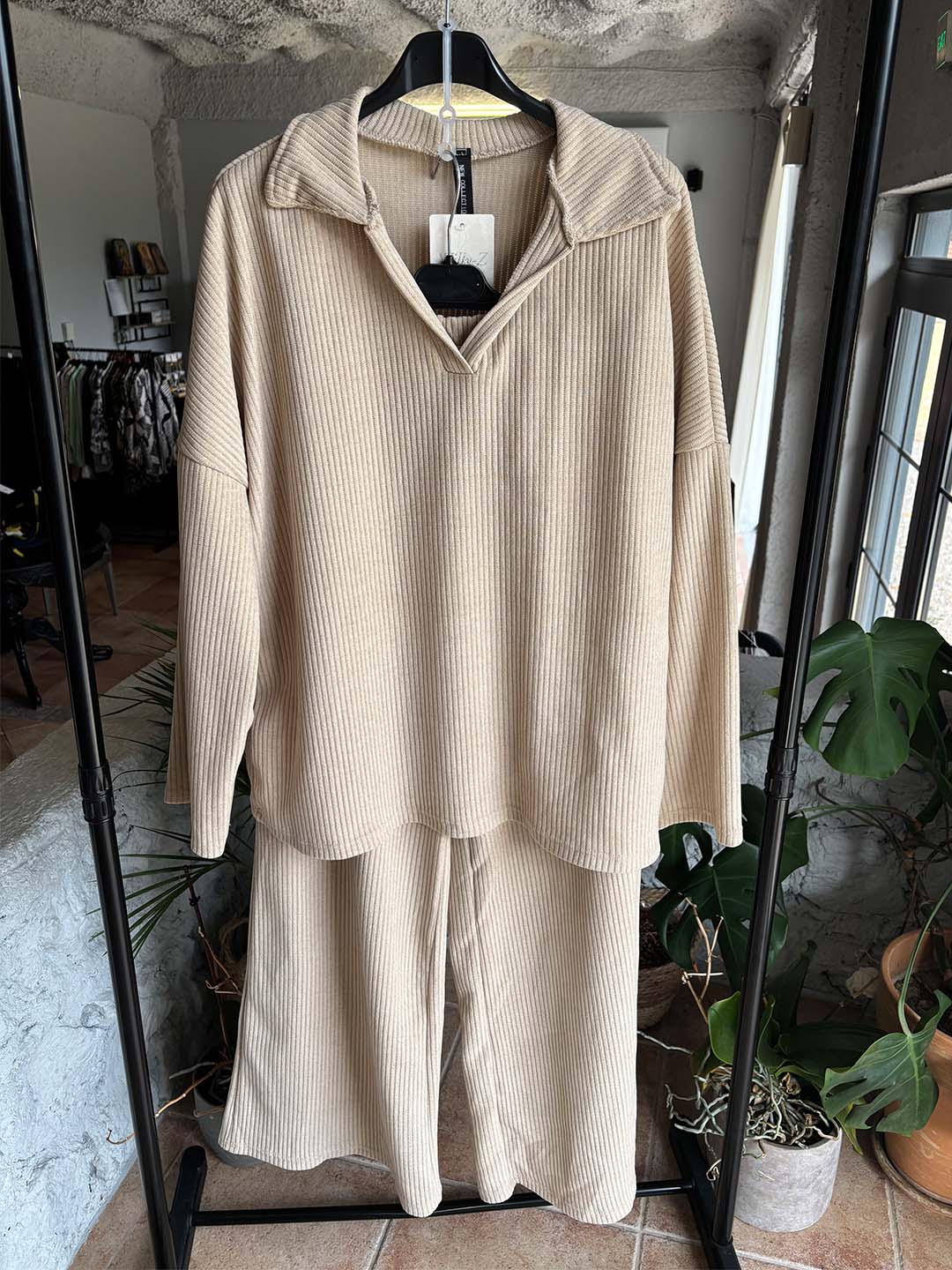 Σετ Εκρού Over Size Κοτλέ Μπλούζα Με Γιακά Και Παντελόνι