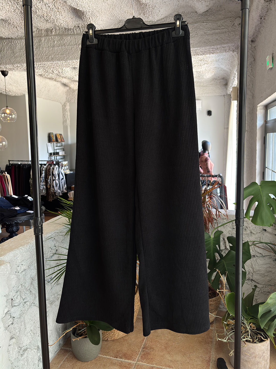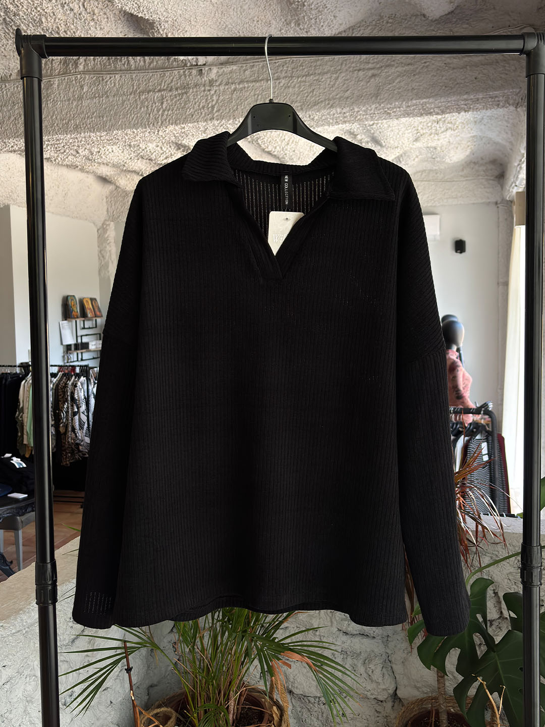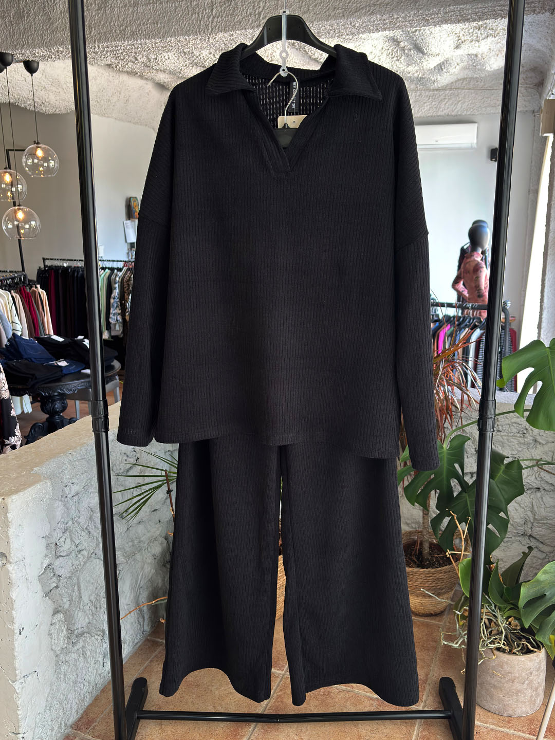 Σετ Μαύρο Over Size Κοτλέ Μπλούζα Με Γιακά Και Παντελόνι