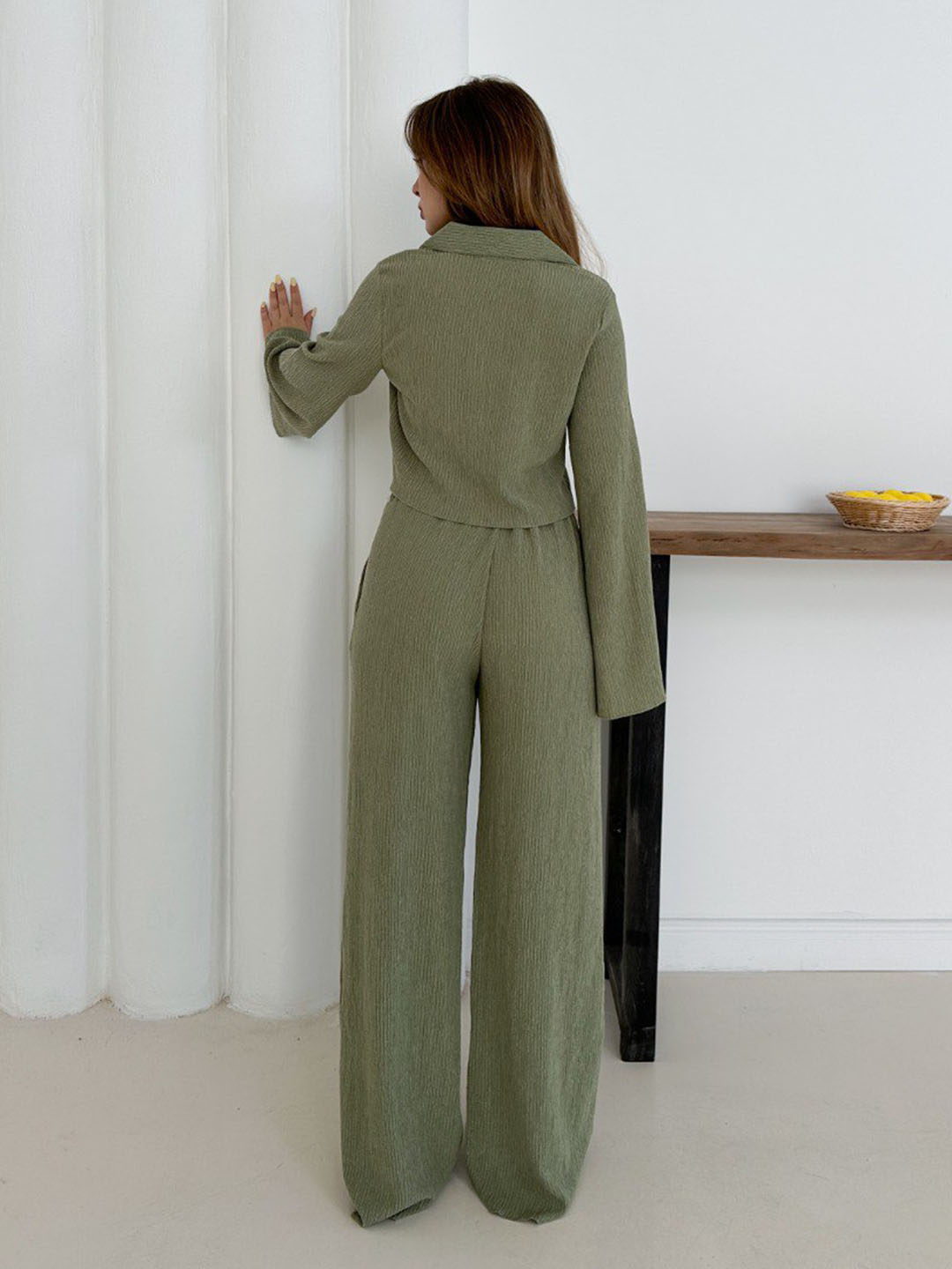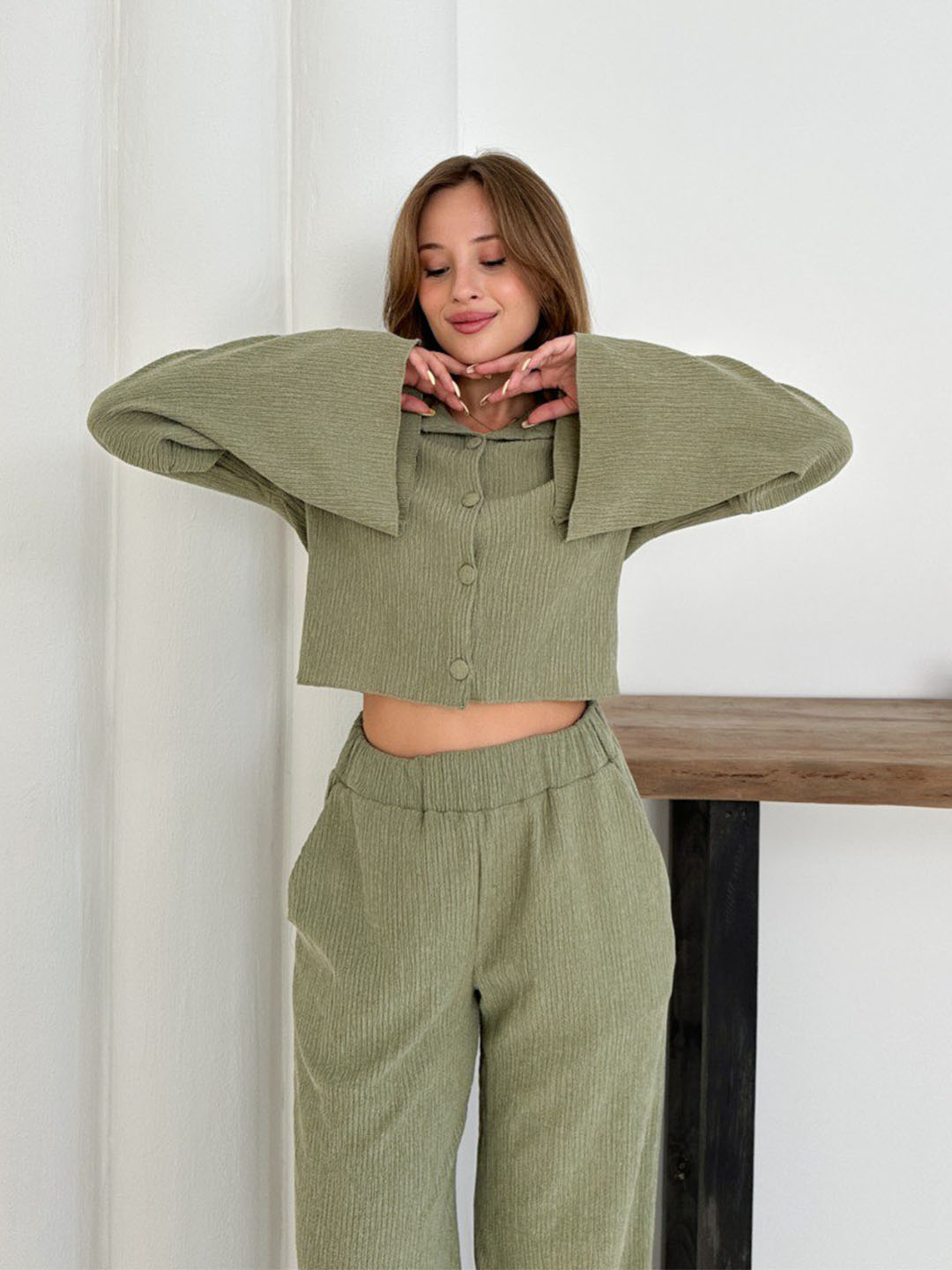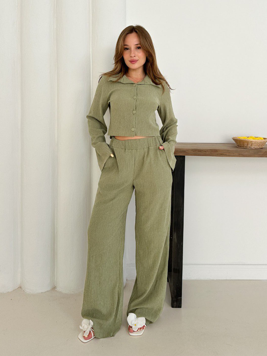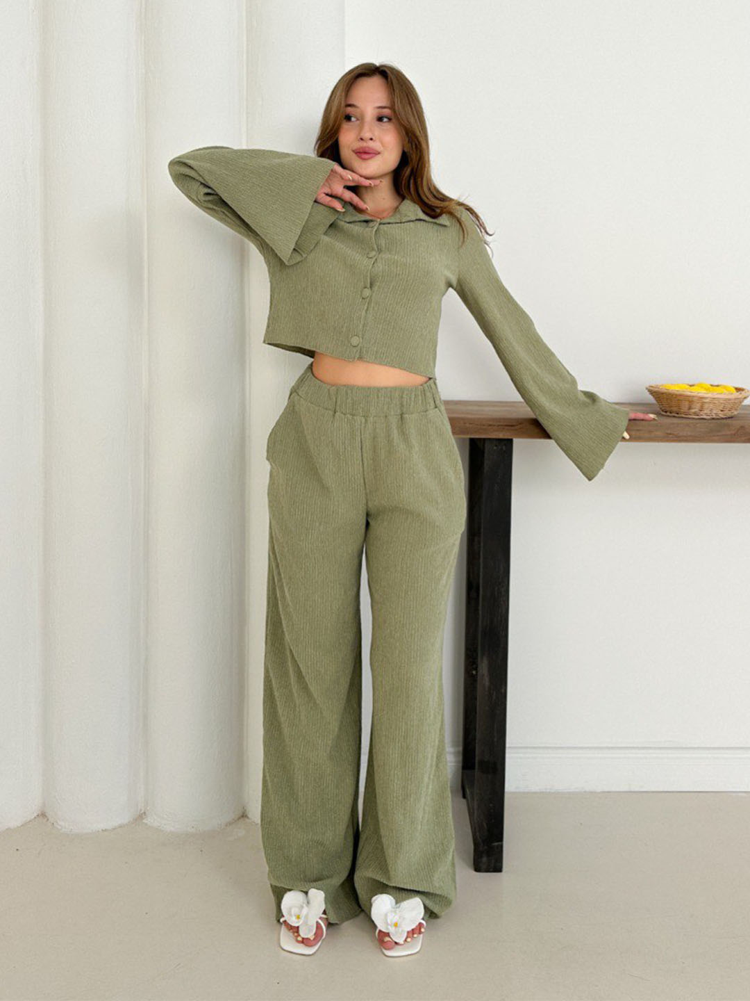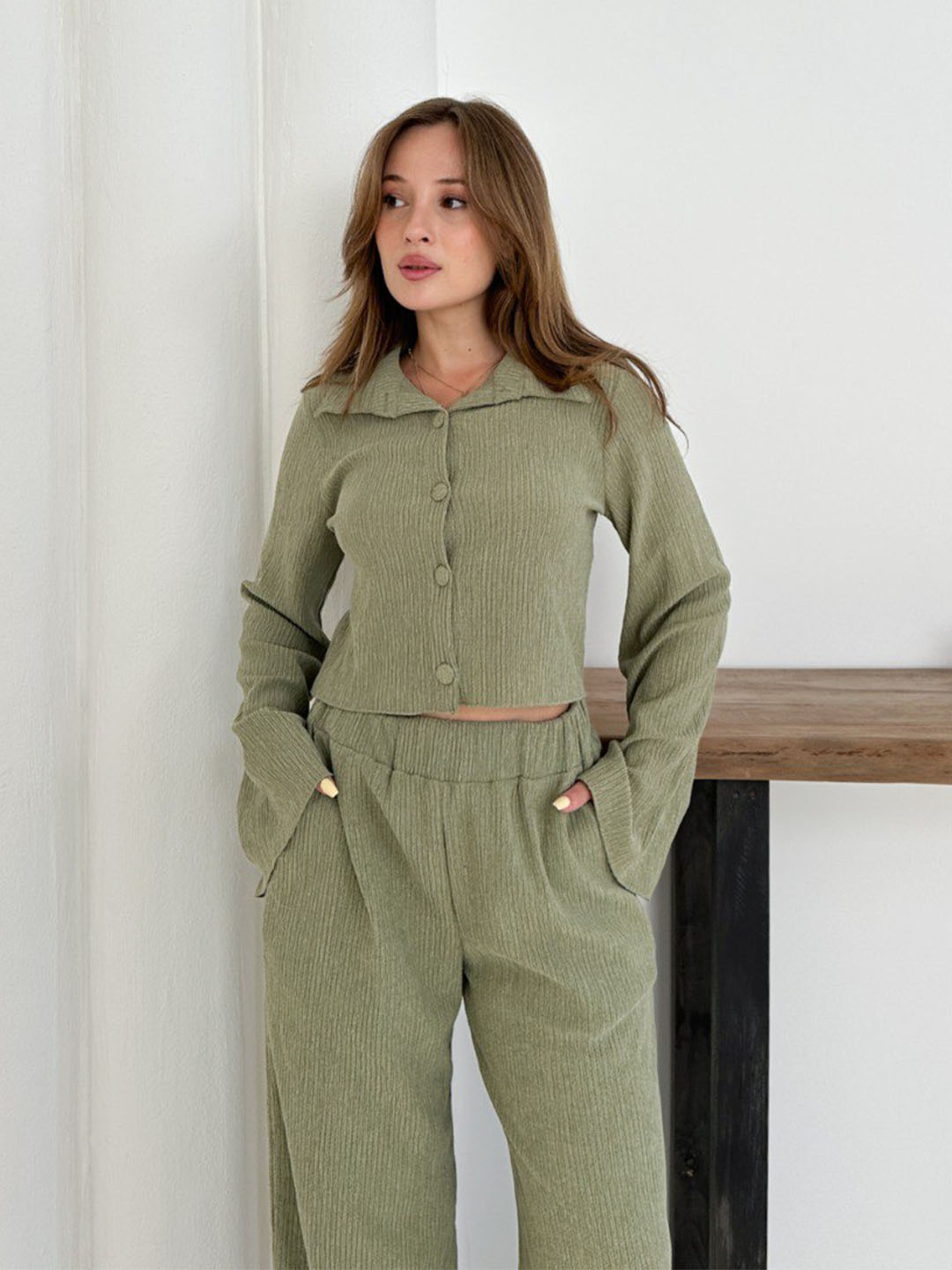 Σετ Πουκάμισο Crop Με Παντελόνα Σε Φυστικί