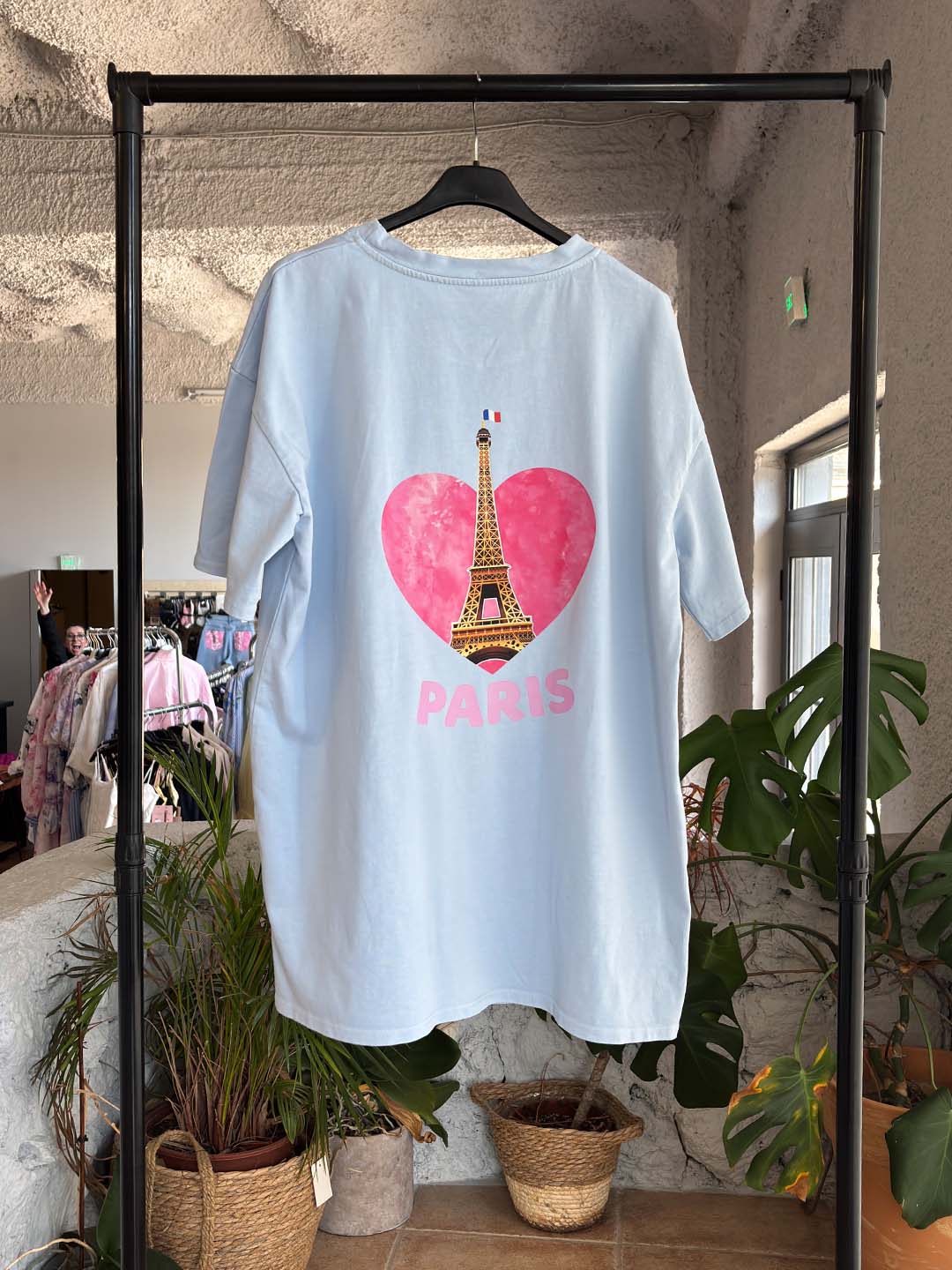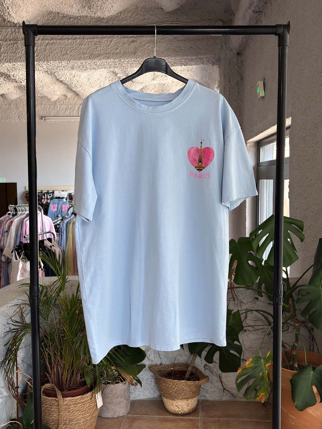 Oversized t-shirt με ιδιαίτερη στάμπα εμπνευσμένη από το Παρίσι που δίνει ένα μοντέρνο και playful στυλ στο outfit. Στο μπροστινό μέρος υπάρχει μικρή στάμπα με καρδιά και τον Πύργο του Άιφελ, ενώ στο πίσω μέρος ξεχωρίζει μεγαλύτερη εντυπωσιακή στάμπα που τραβάει τα βλέμματα.