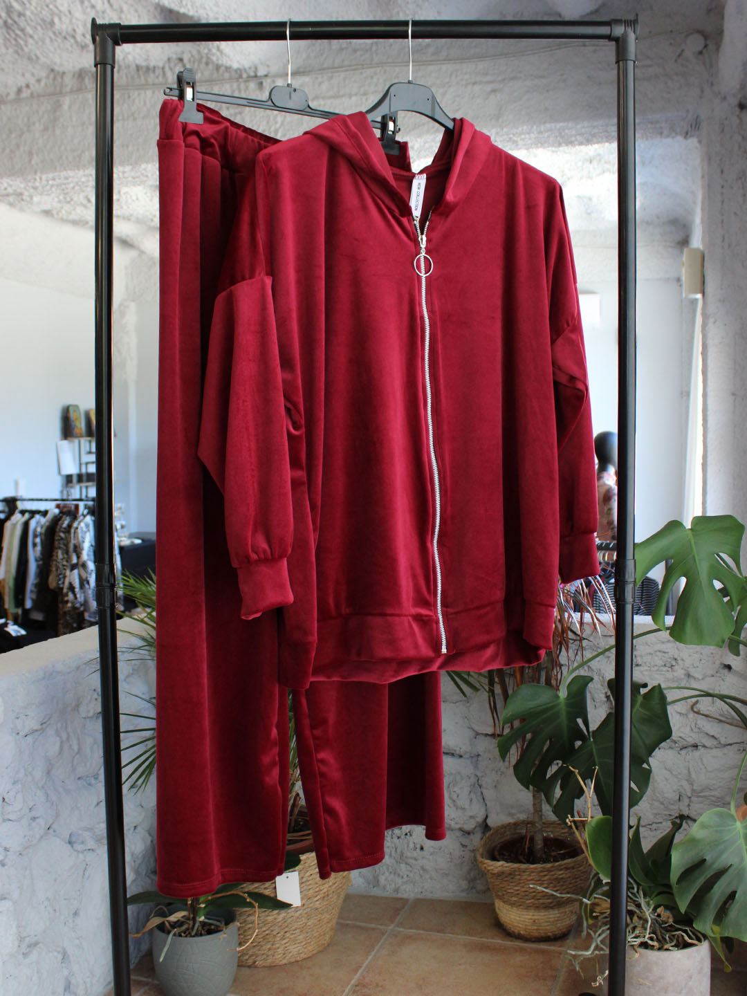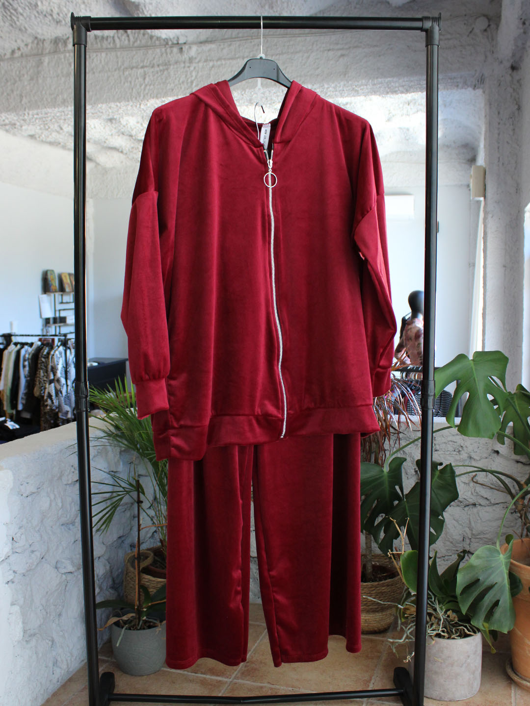Σετ Μπορντό Βελουτέ Plus Size Ζακέτα Με Κουκούλα Και Παντελόνι
