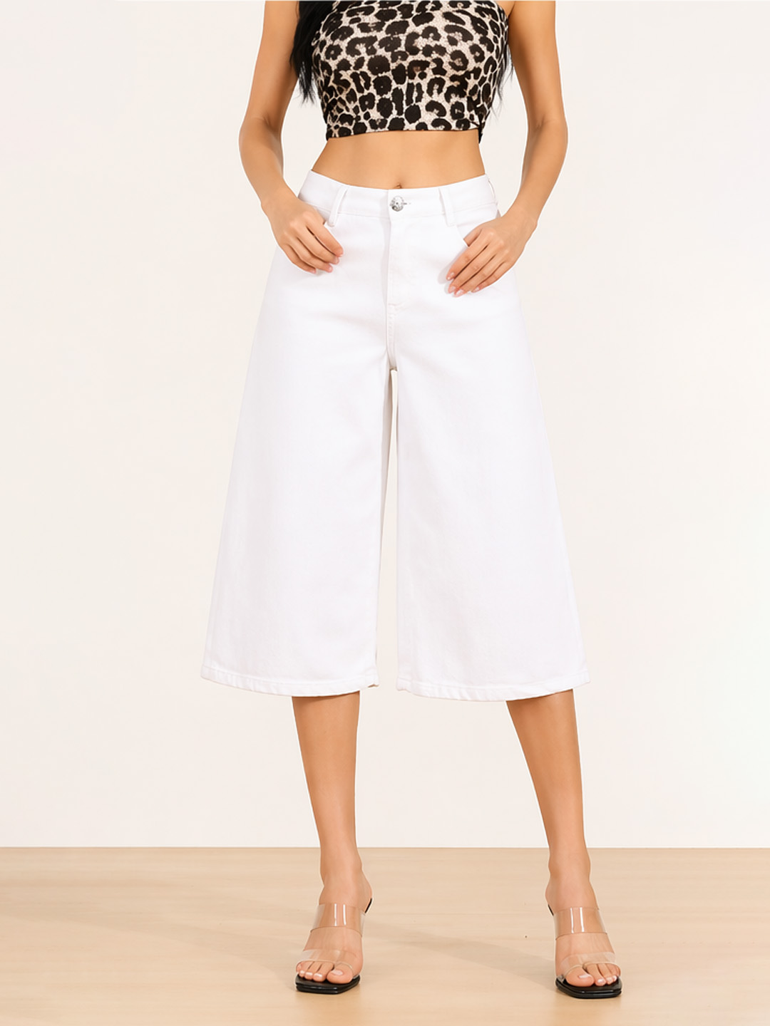 Η Plus Size Λευκή Denim Culotte έχει χαλαρή γραμμή και μήκος κάτω από το γόνατο, προσφέροντας άνεση και στυλ για όλες τις ώρες της ημέρας.