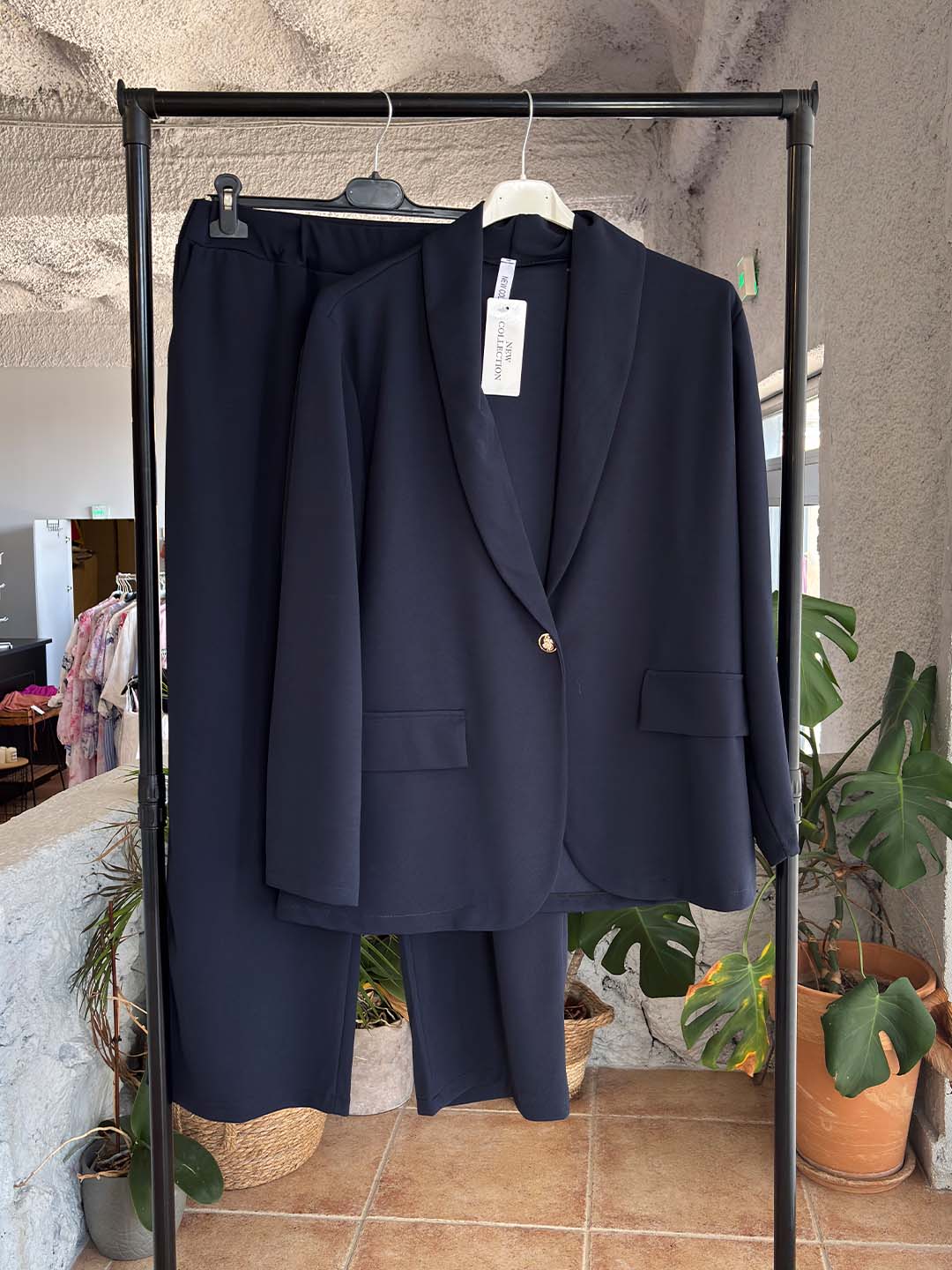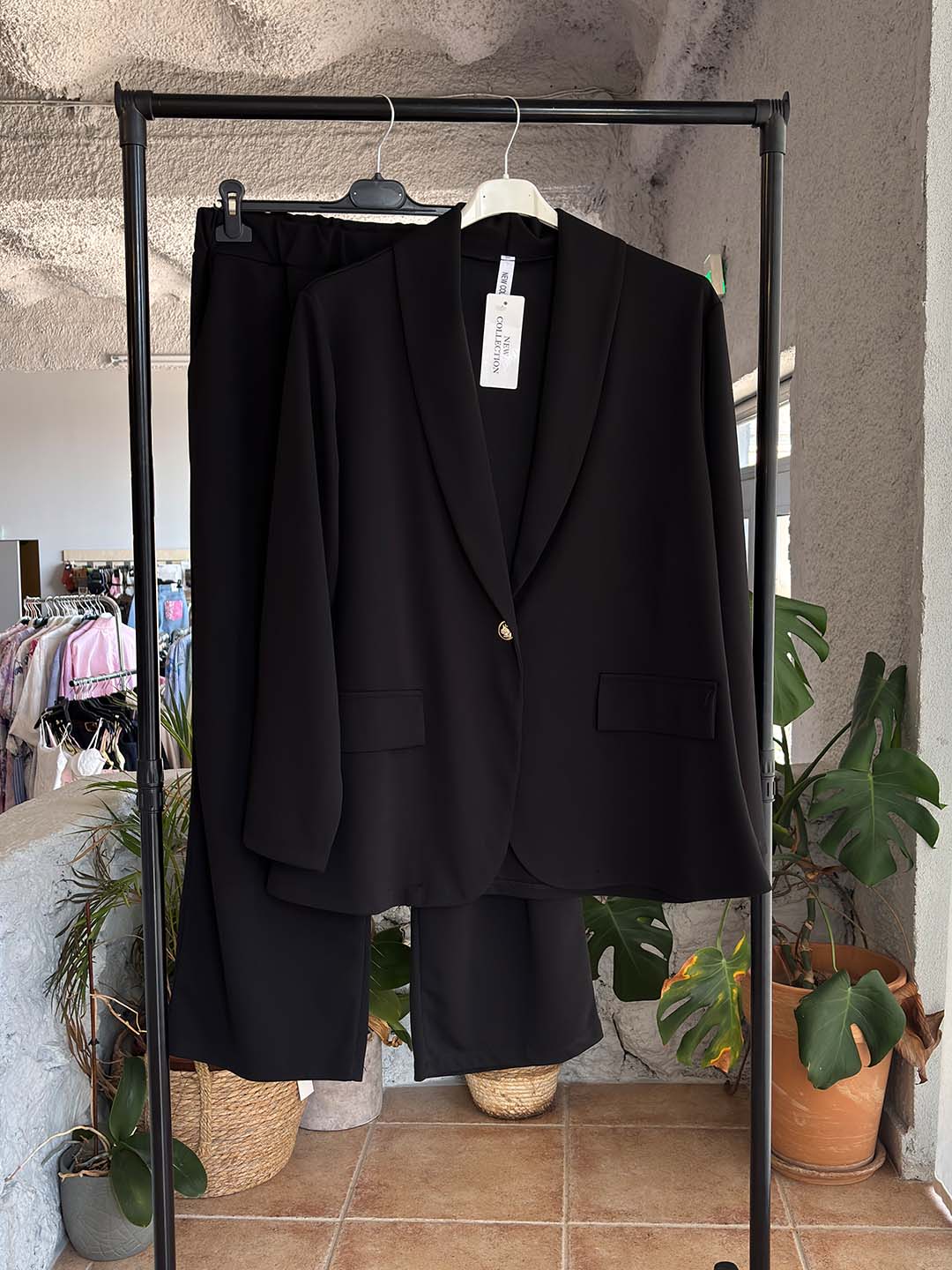 Η παντελόνα με άνετη γραμμή και λάστιχο στη μέση προσφέρει πολύ καλή εφαρμογή και άνεση, κάνοντας το σύνολο ιδανικό τόσο για καθημερινές εμφανίσεις όσο και για πιο επίσημες περιστάσεις. Το σετ μπορεί να φορεθεί μαζί για ολοκληρωμένο look ή να συνδυαστεί ξεχωριστά με άλλα κομμάτια της γκαρνταρόμπας.