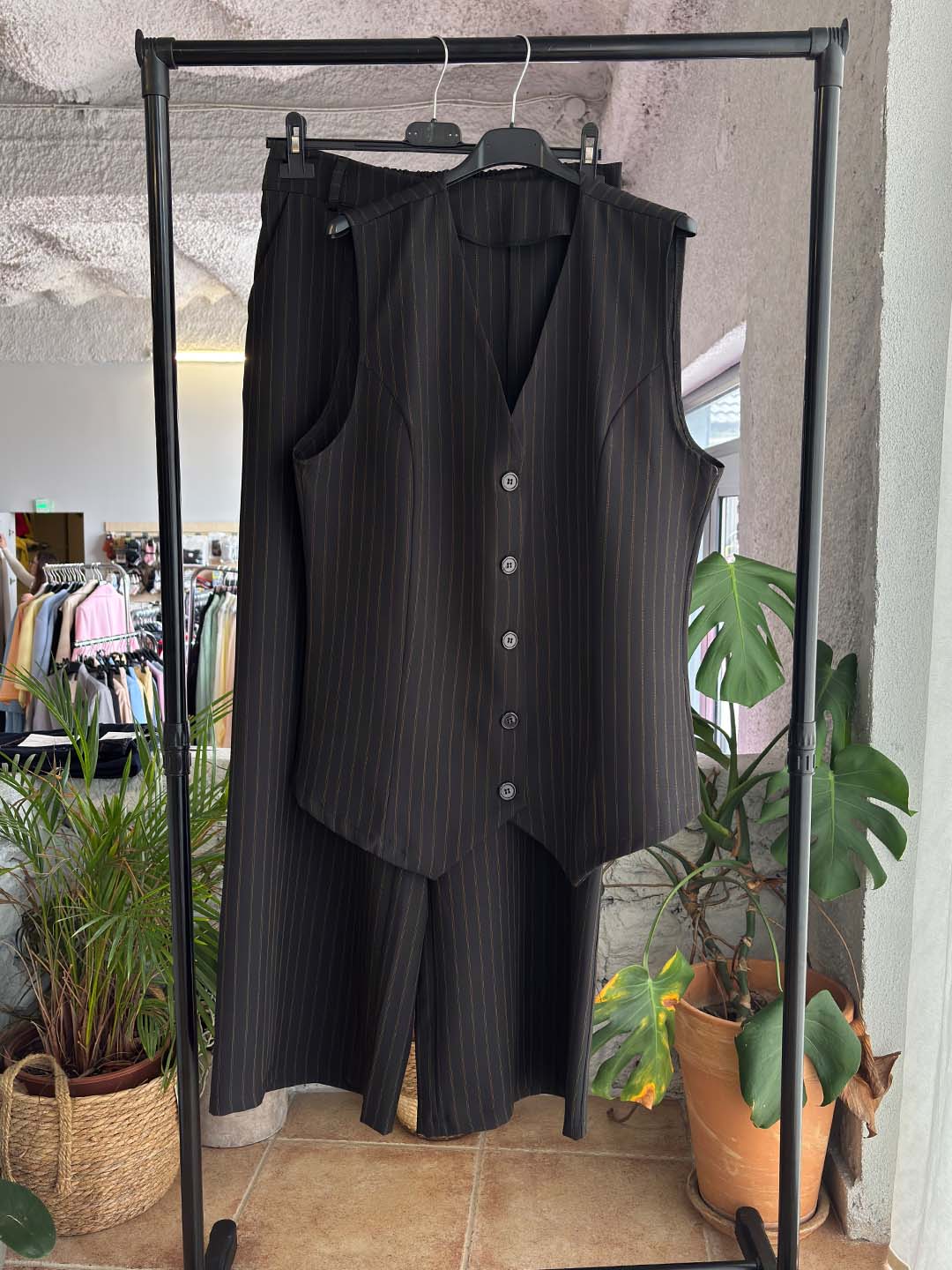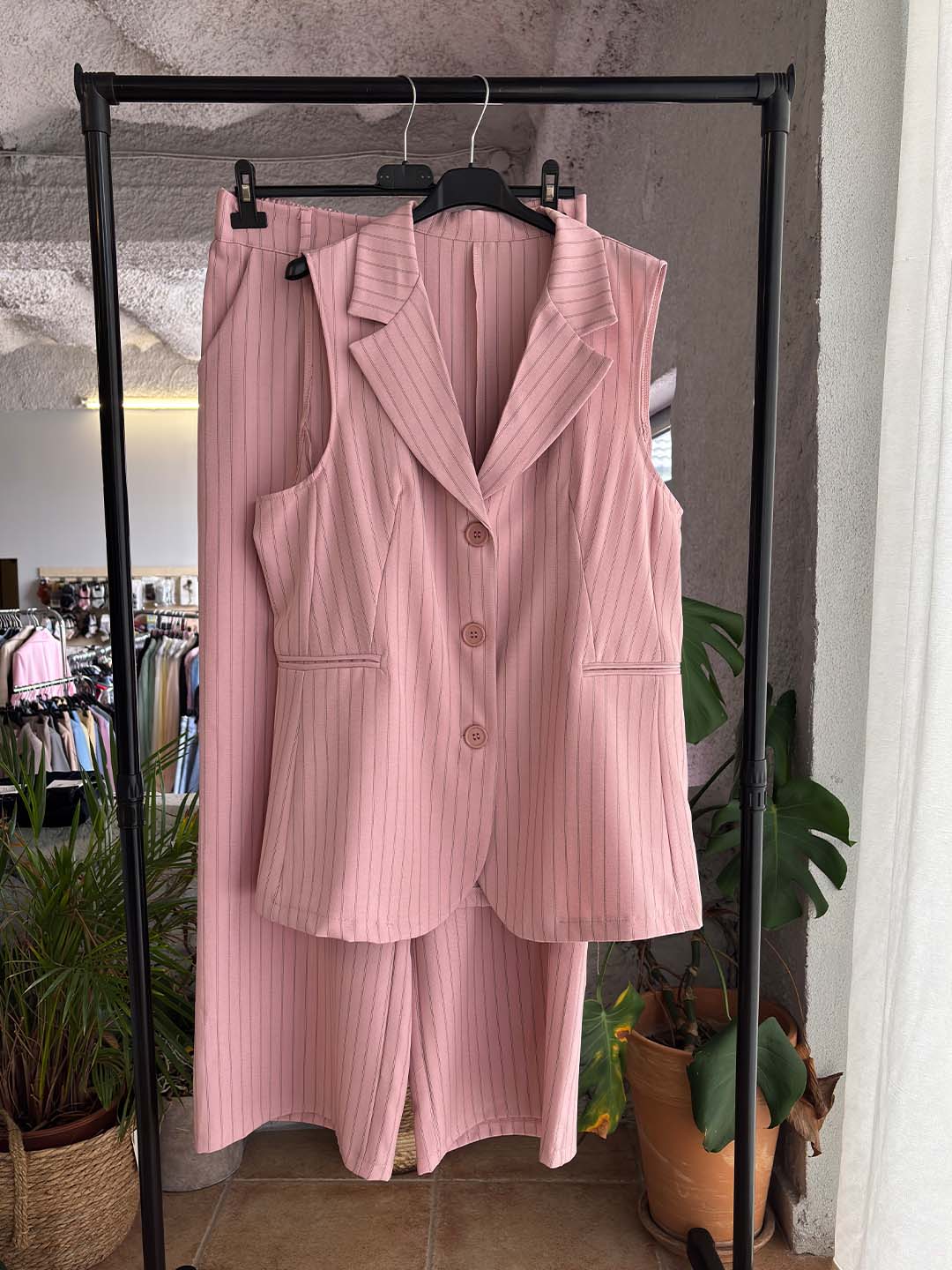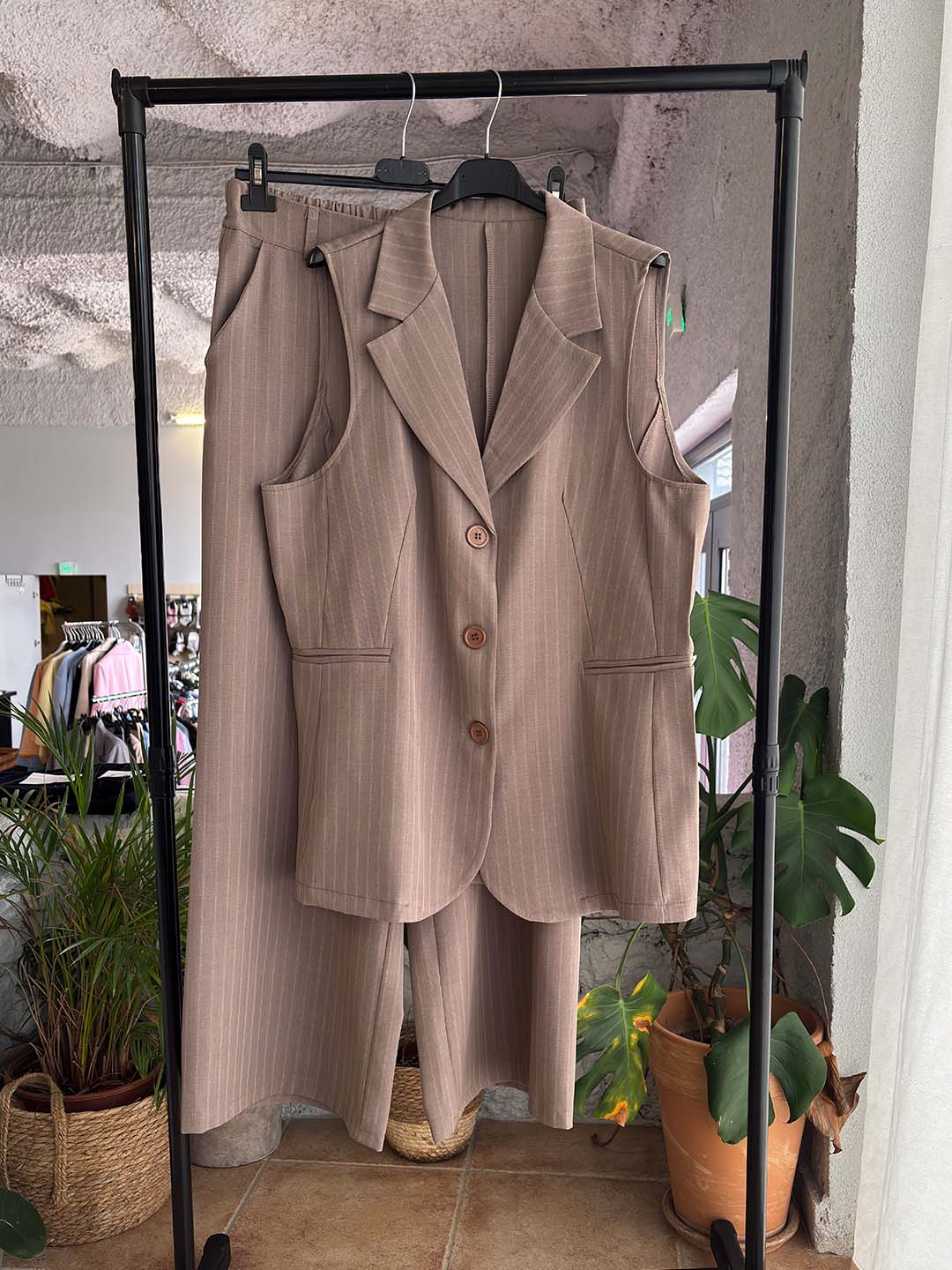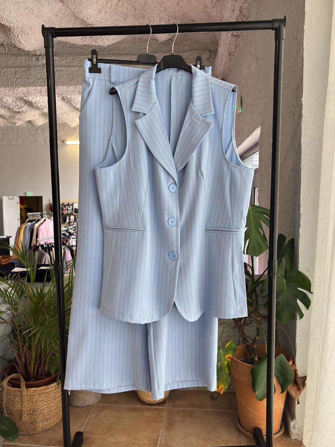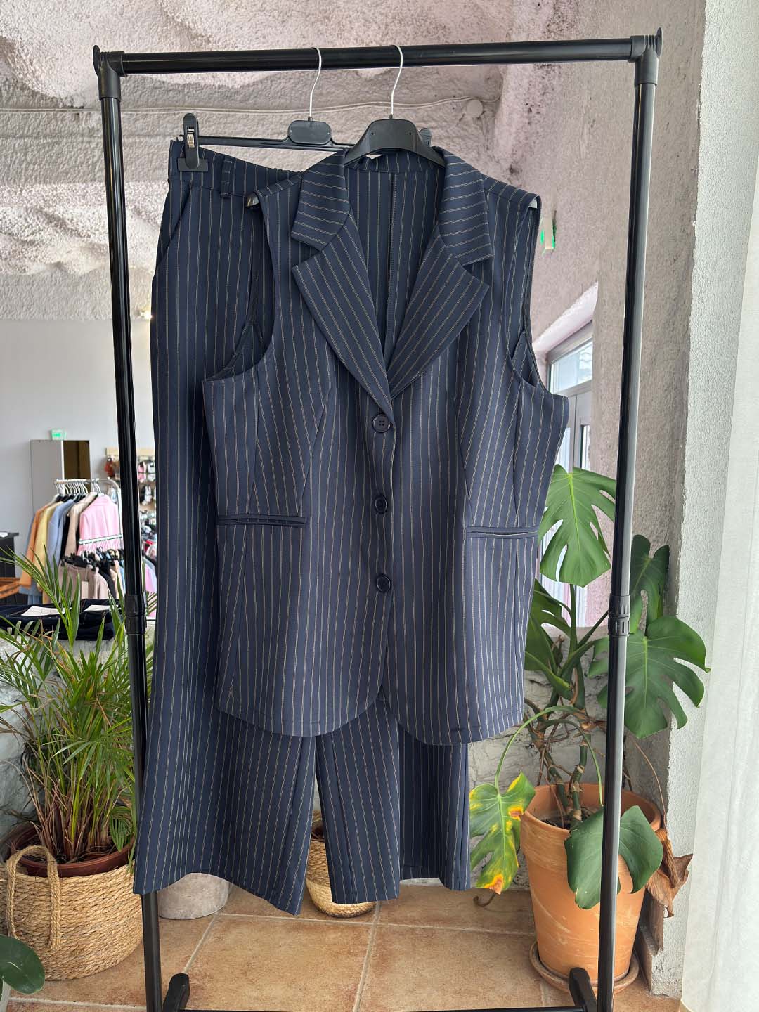 Κομψό και σύγχρονο κοστούμι που απογειώνει το καθημερινό αλλά και πιο προσεγμένο ντύσιμο. Το σετ αποτελείται από αμάνικο σακάκι με ριγέ σχέδιο και παντελόνα σε άνετη γραμμή, προσφέροντας στυλ και άνεση όλη μέρα.