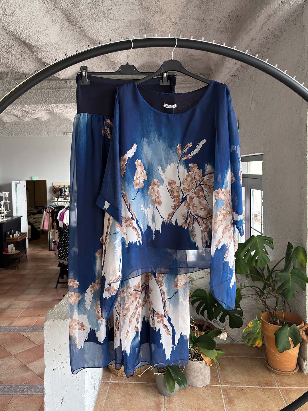 Αποτελείται από ανάλαφρη μπλούζα με χαλαρή γραμμή και παντελόνα με ελαστική μπασκά στη μέση, που εφαρμόζει απαλά χωρίς να πιέζει και αγκαλιάζει όμορφα τη σιλουέτα.